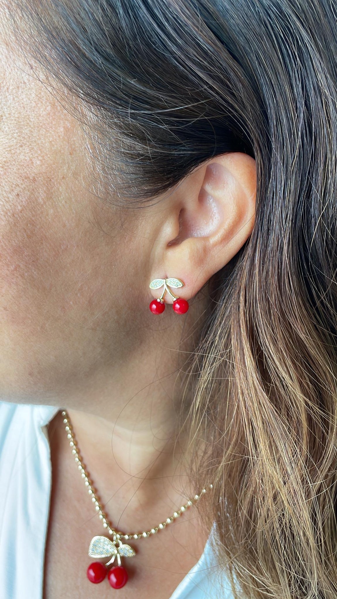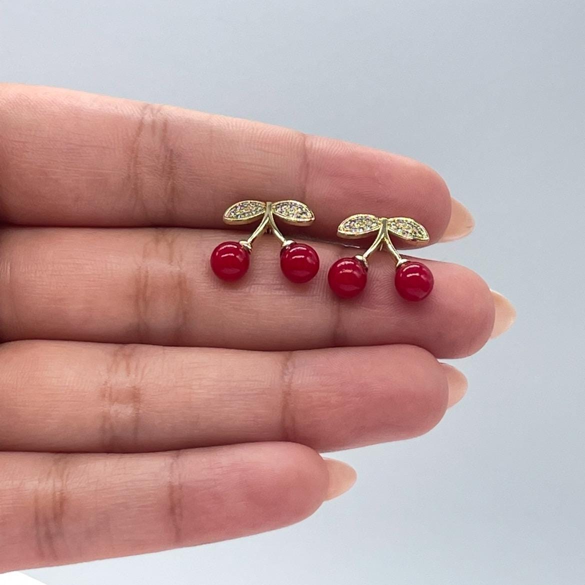 • Load image into Gallery viewer, 18k Gold Filled Classic Red Cherry Stud Earring with CZ Stems