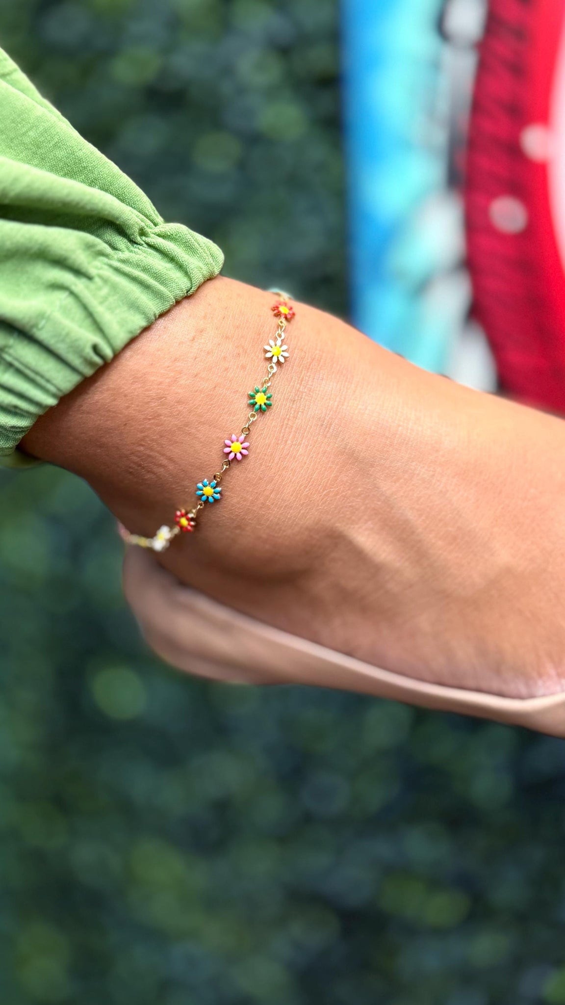18k Gold Filled Colorful Enamel Multicolored Flower-Patterned Anklet, Summer Jewlery Nature Jewlery, For Her, For Girl