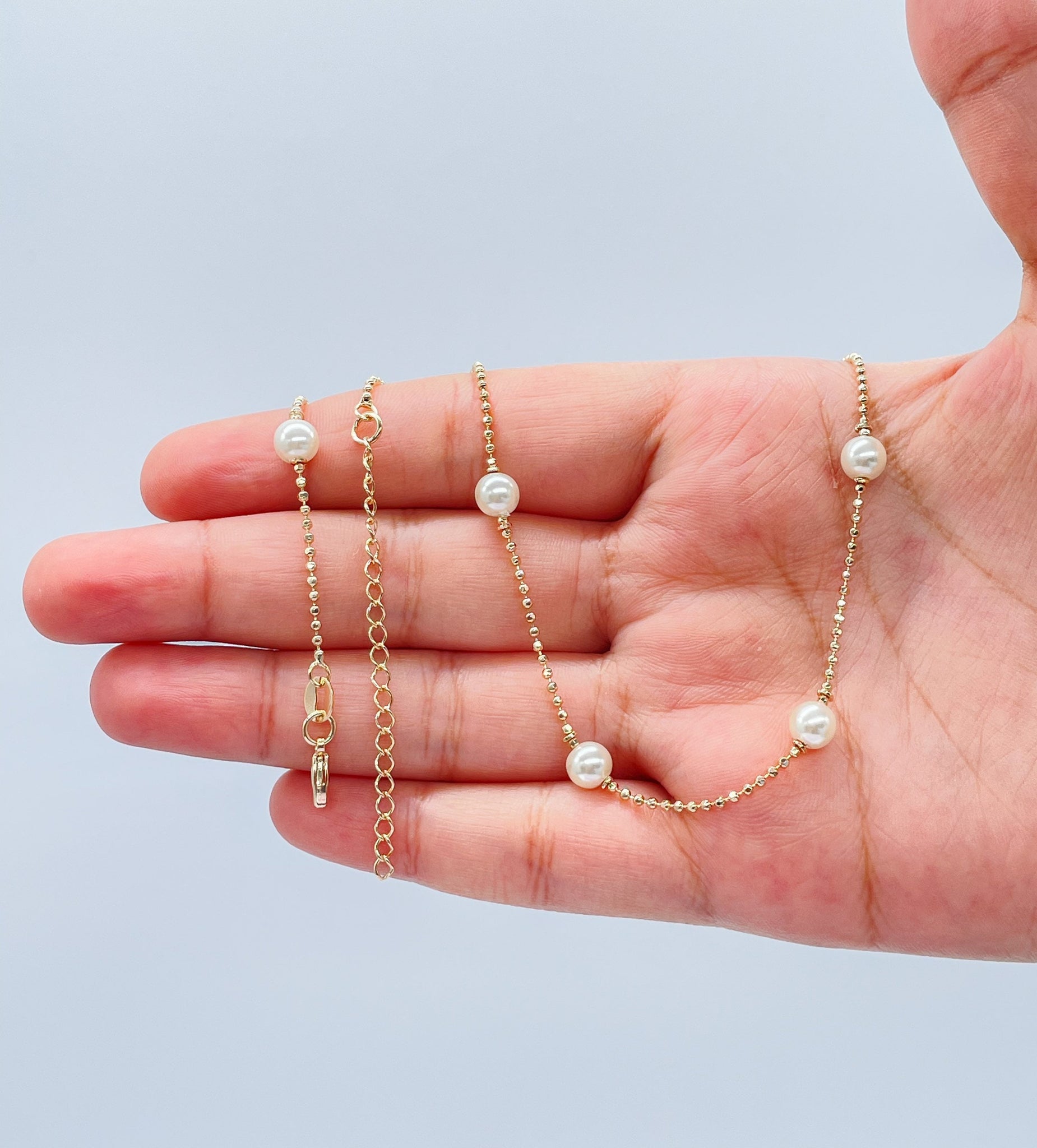 18k Gold Filled Pearl Necklace Bracelet Set: Shinny Ball Chain