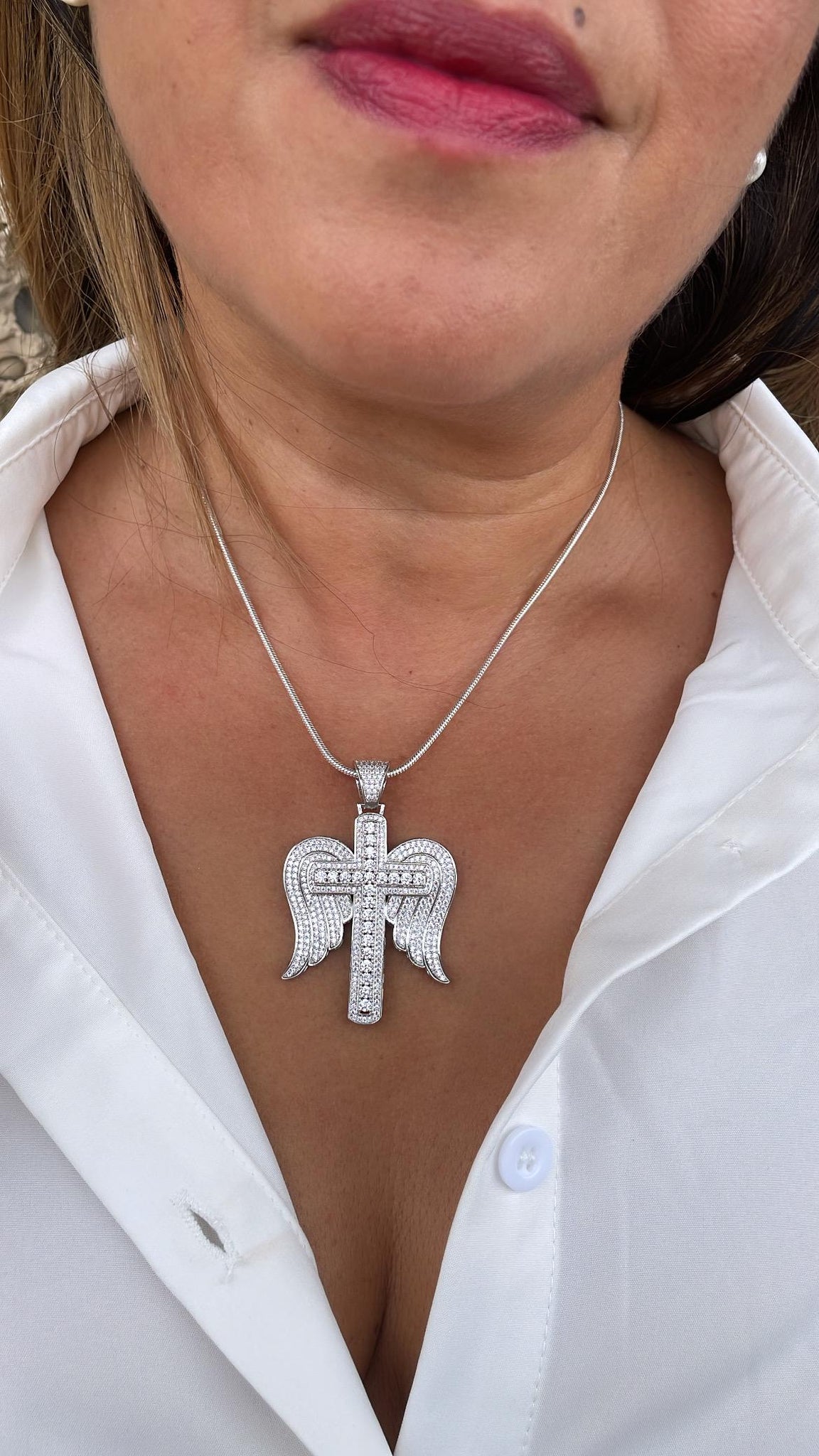 18k Gold & Silver Filled CZ Pave Zirconia Open Angel Wings Angel featuring a Stone Cross in the Center