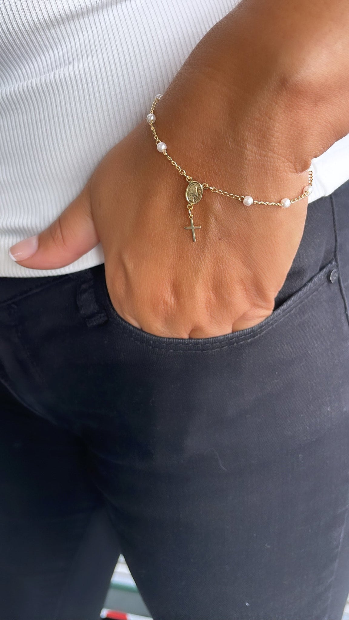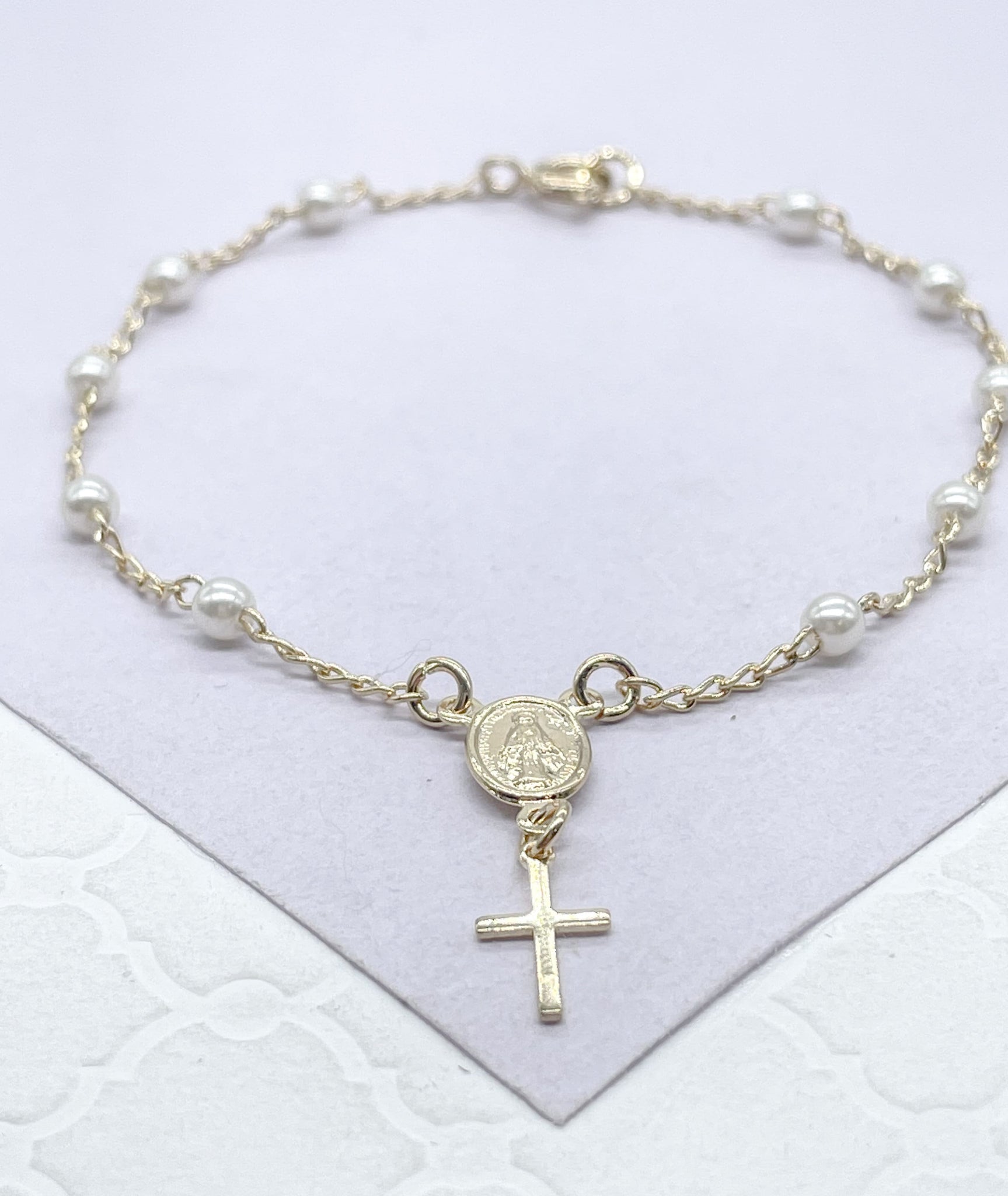 18k Dainty Gold-Filled Beaded Pearl Satellite Rosary Bracelet with Virgin Mary and Crucifix Charm