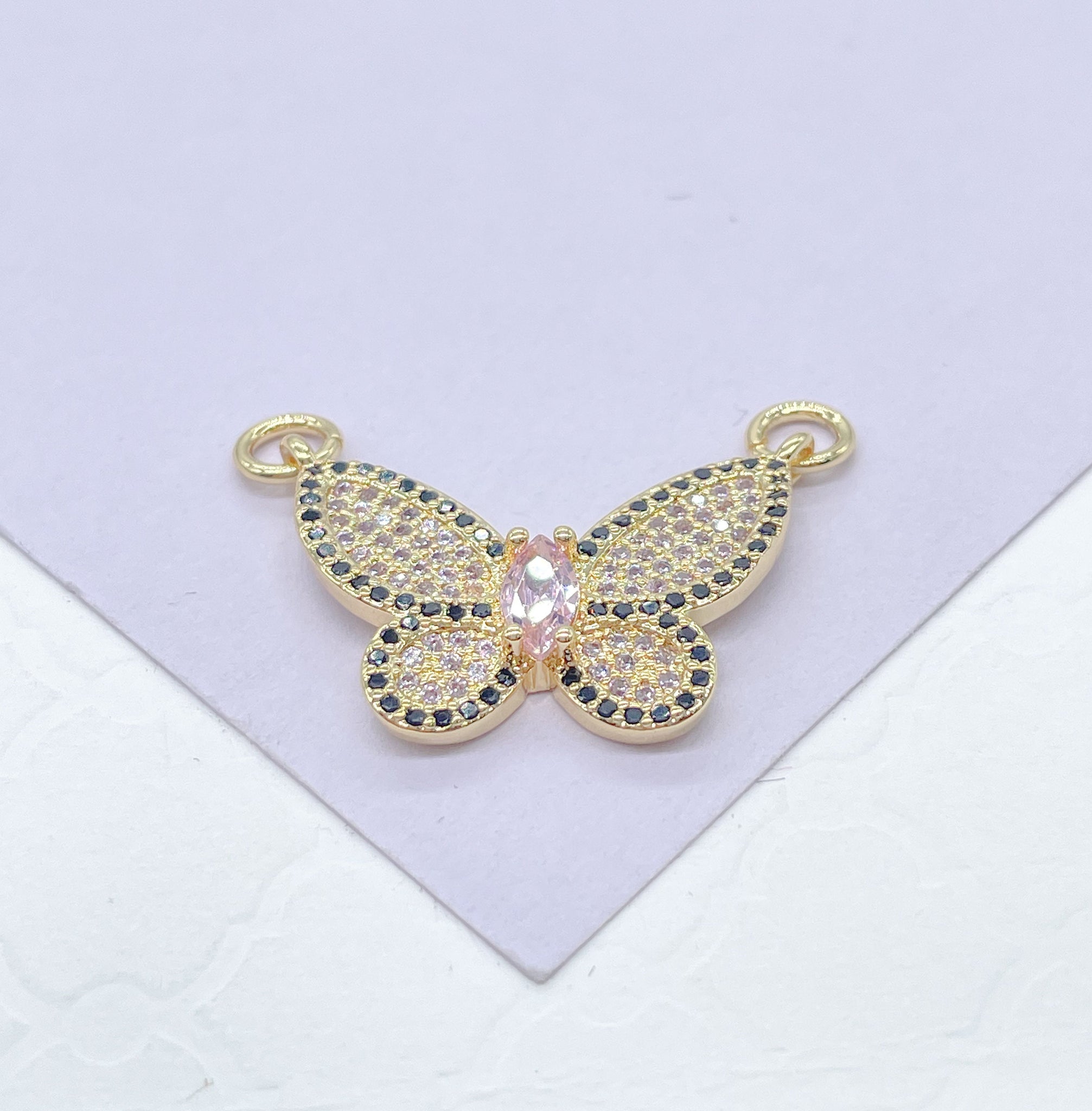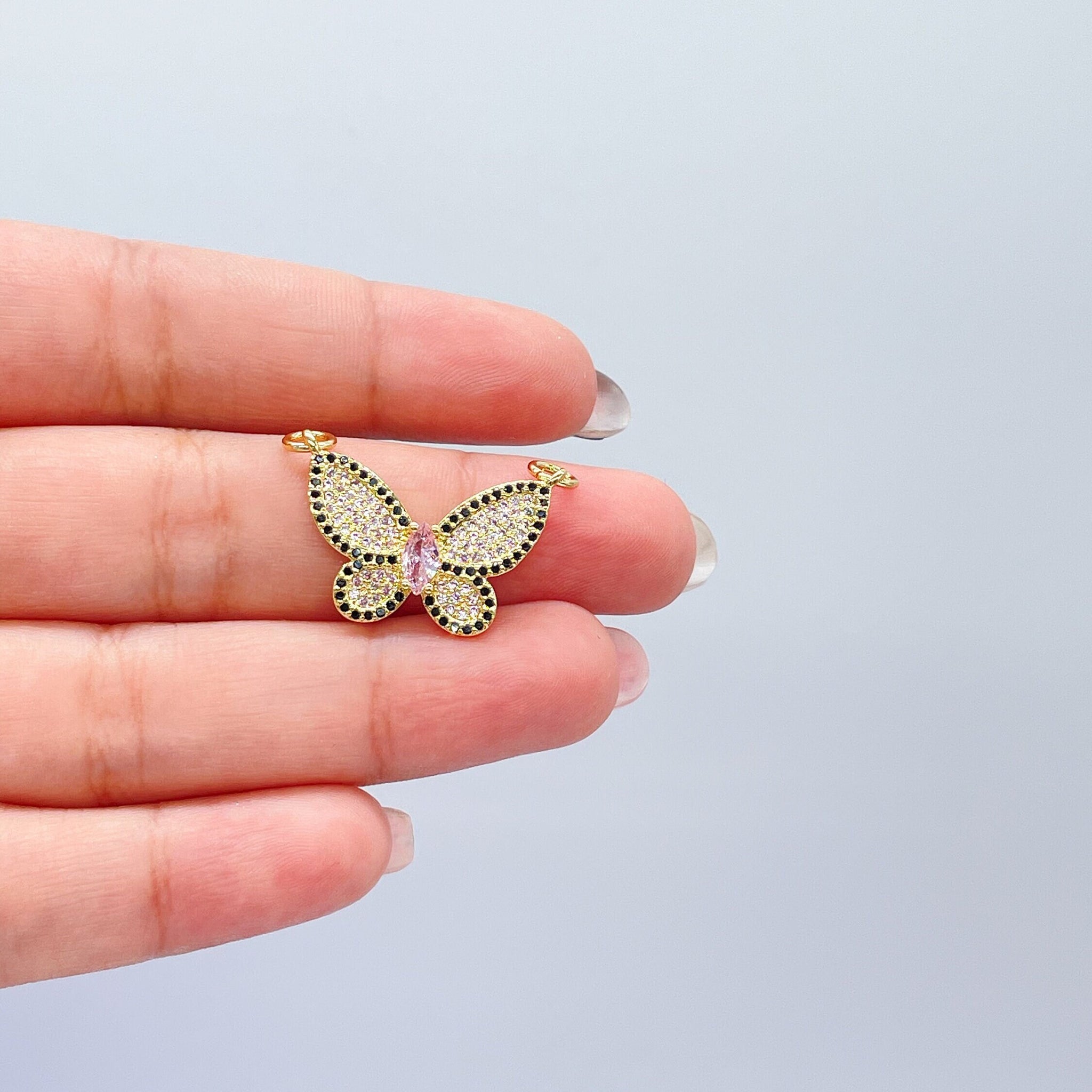18k Gold Filled Baby Pink Butterfly Pendant With Black Pave Outline With Marquise Cut Center, For Jewlery Making, Dainty Butterfly
