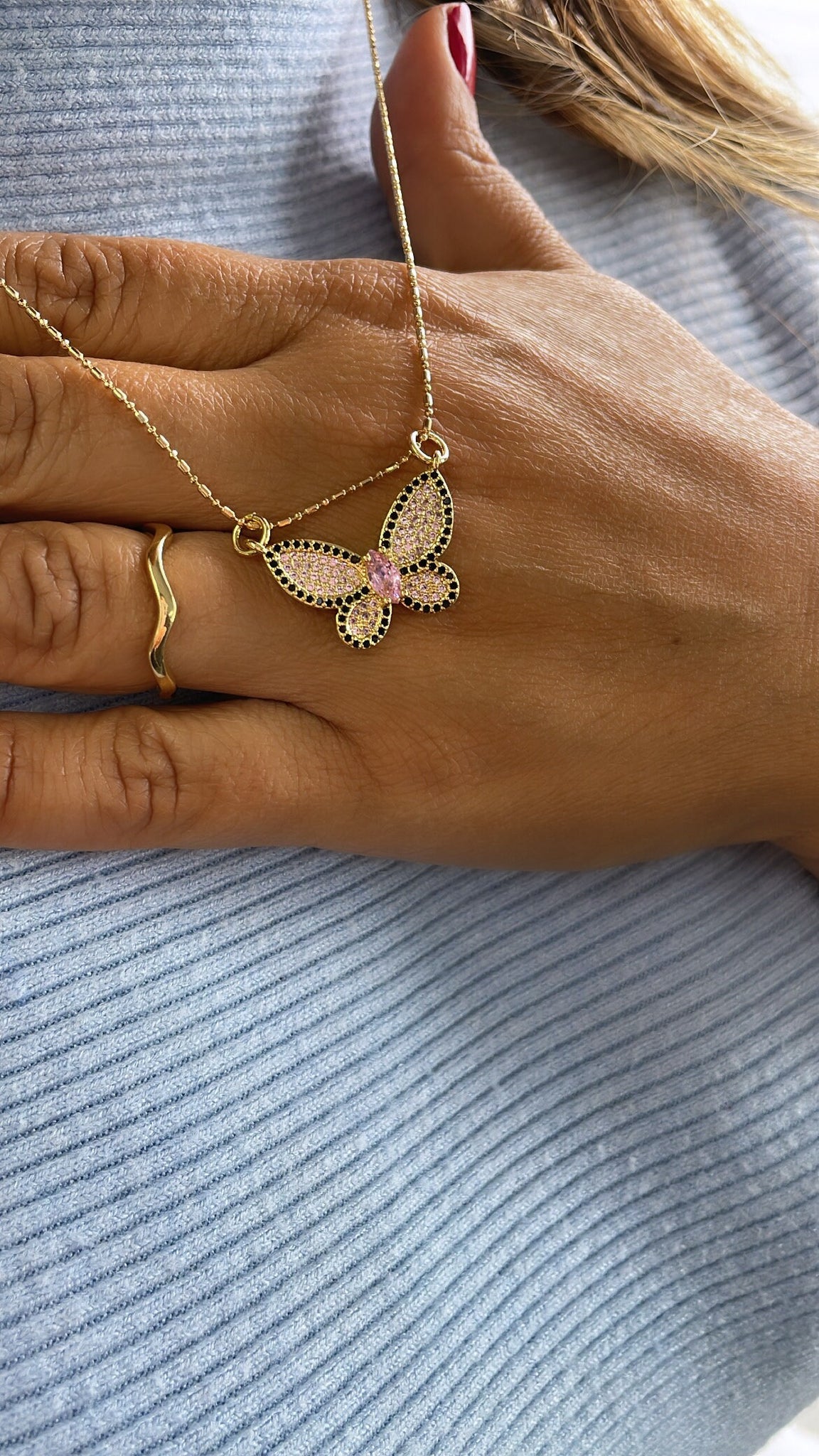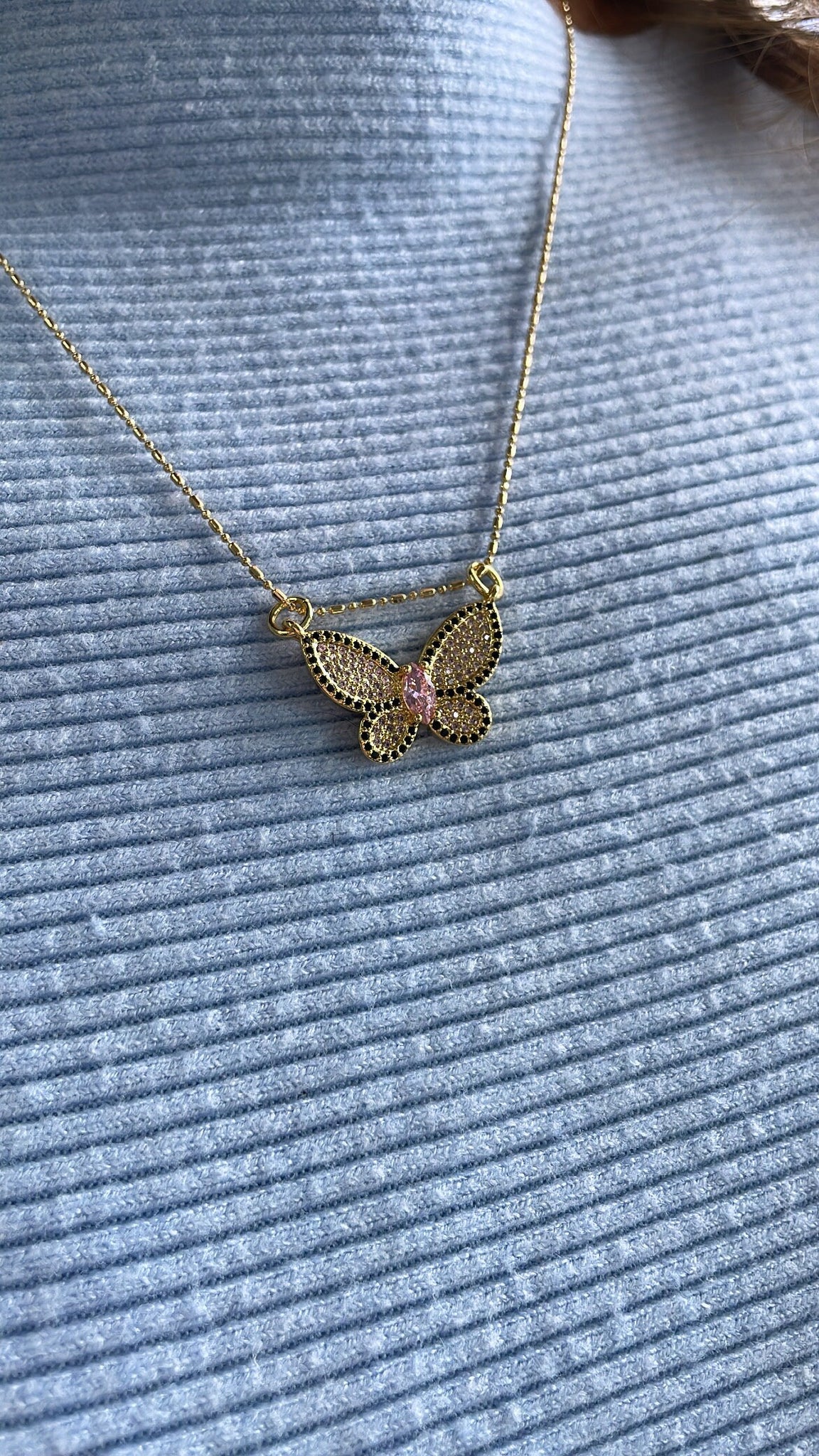18k Gold Filled Butterfly Pendant: Baby Pink, Black Pave Outline