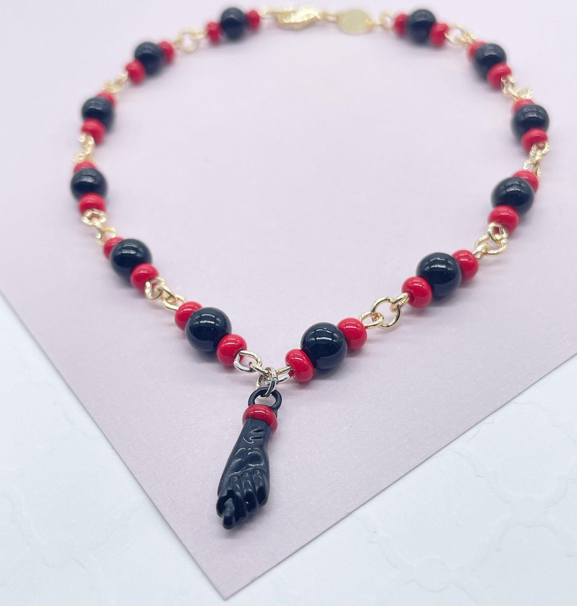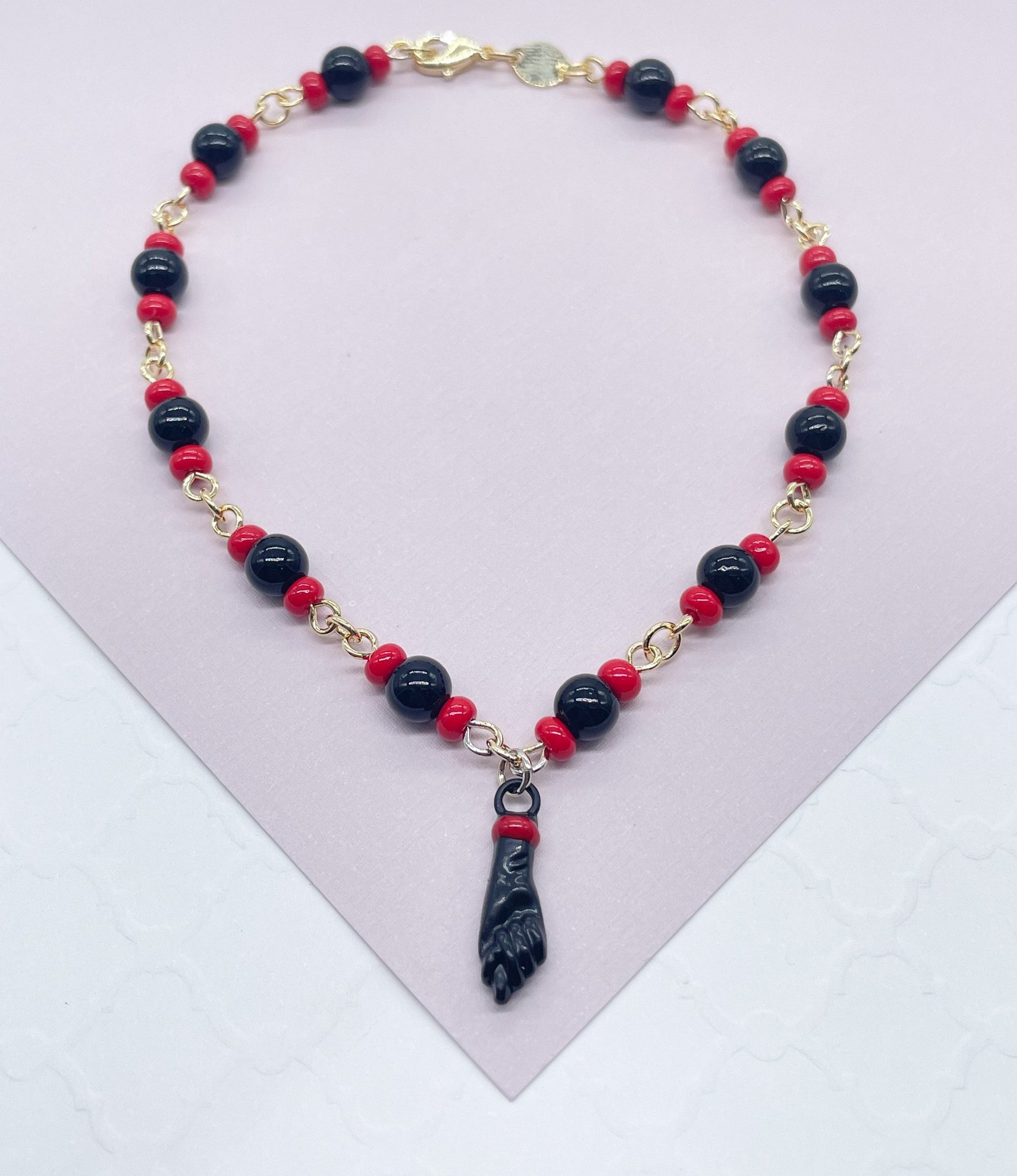 18k Gold Filled Beaded Simulated Azabache Anklet Featuring Black "Figa" Charm