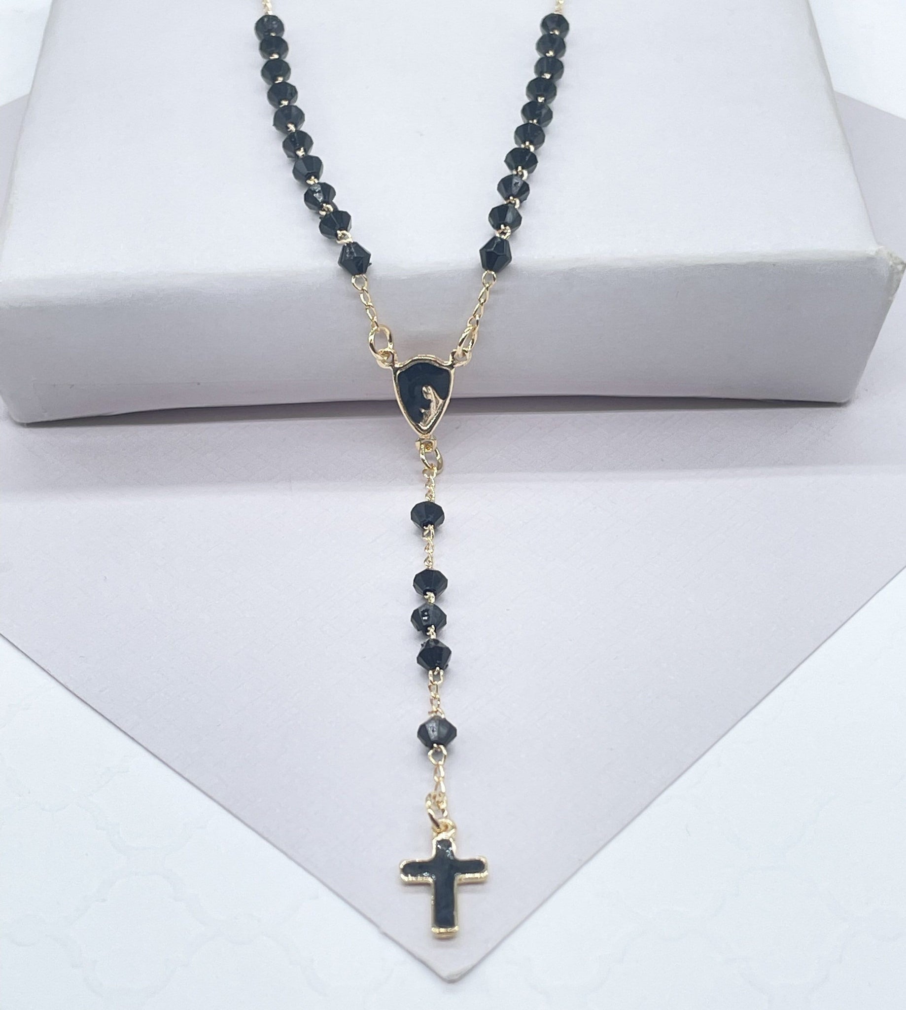 18k Gold Filled Black Beaded Rosary, Onix Style Stone