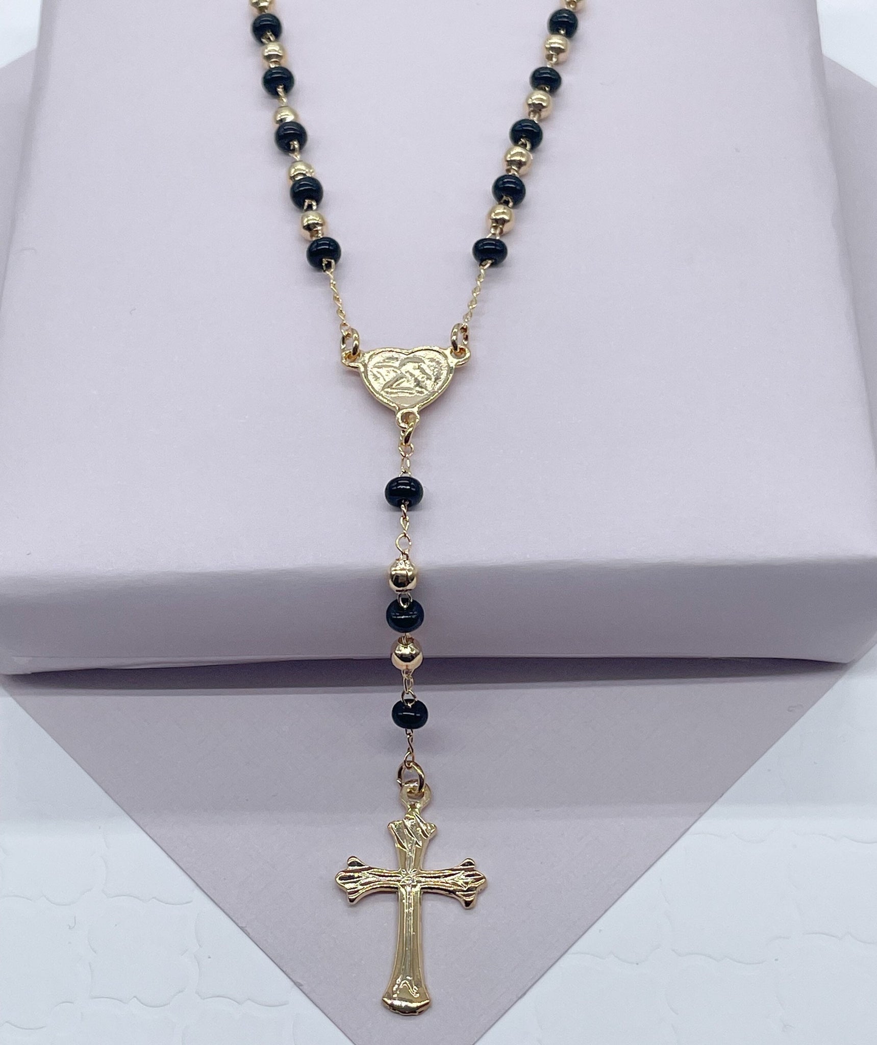 18k Gold Filled Black Beaded Rosary with Angel and Cross