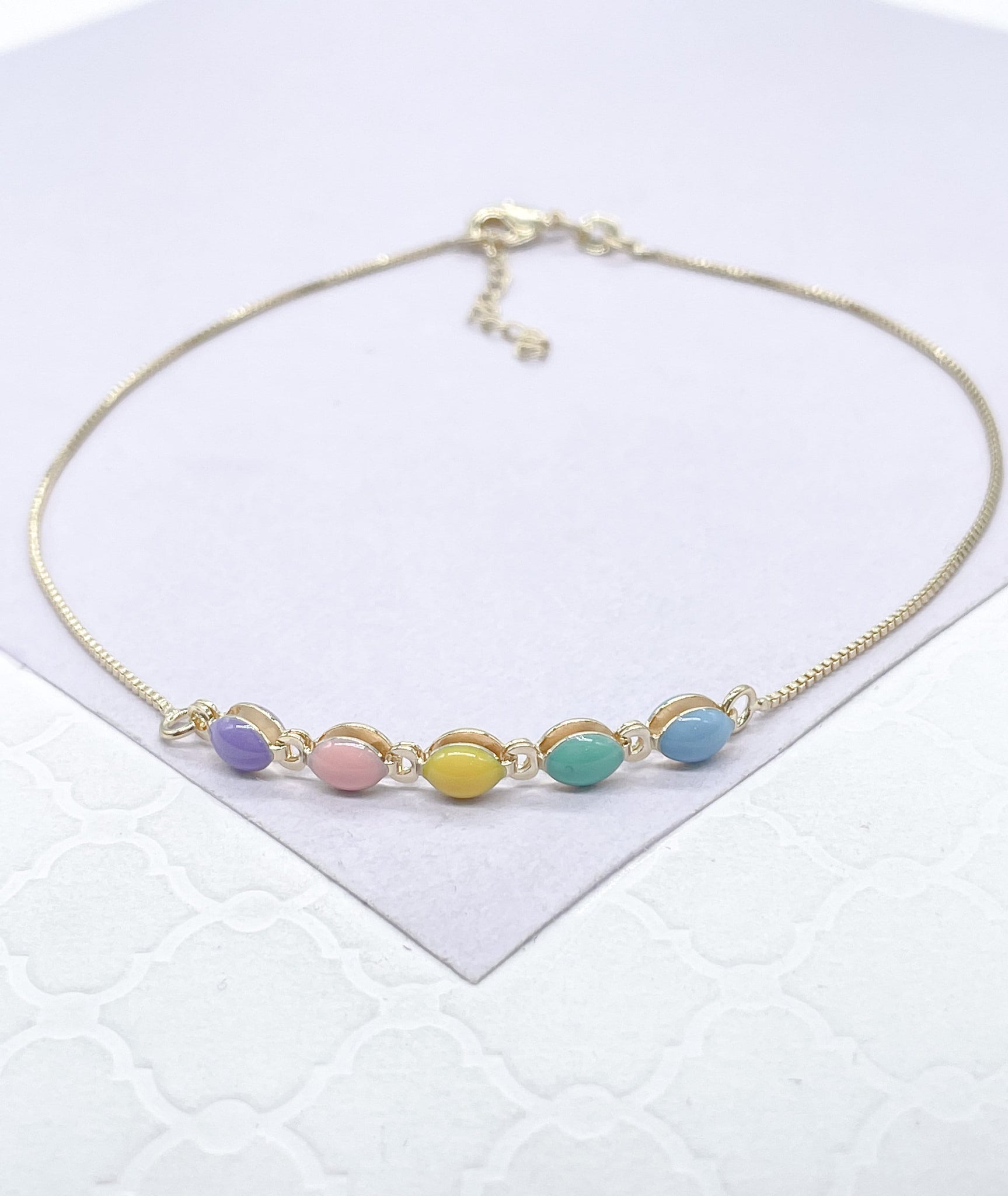 18k Gold Filled Box Chain Anklet with Pastel Colored Enamel Hollow Beads