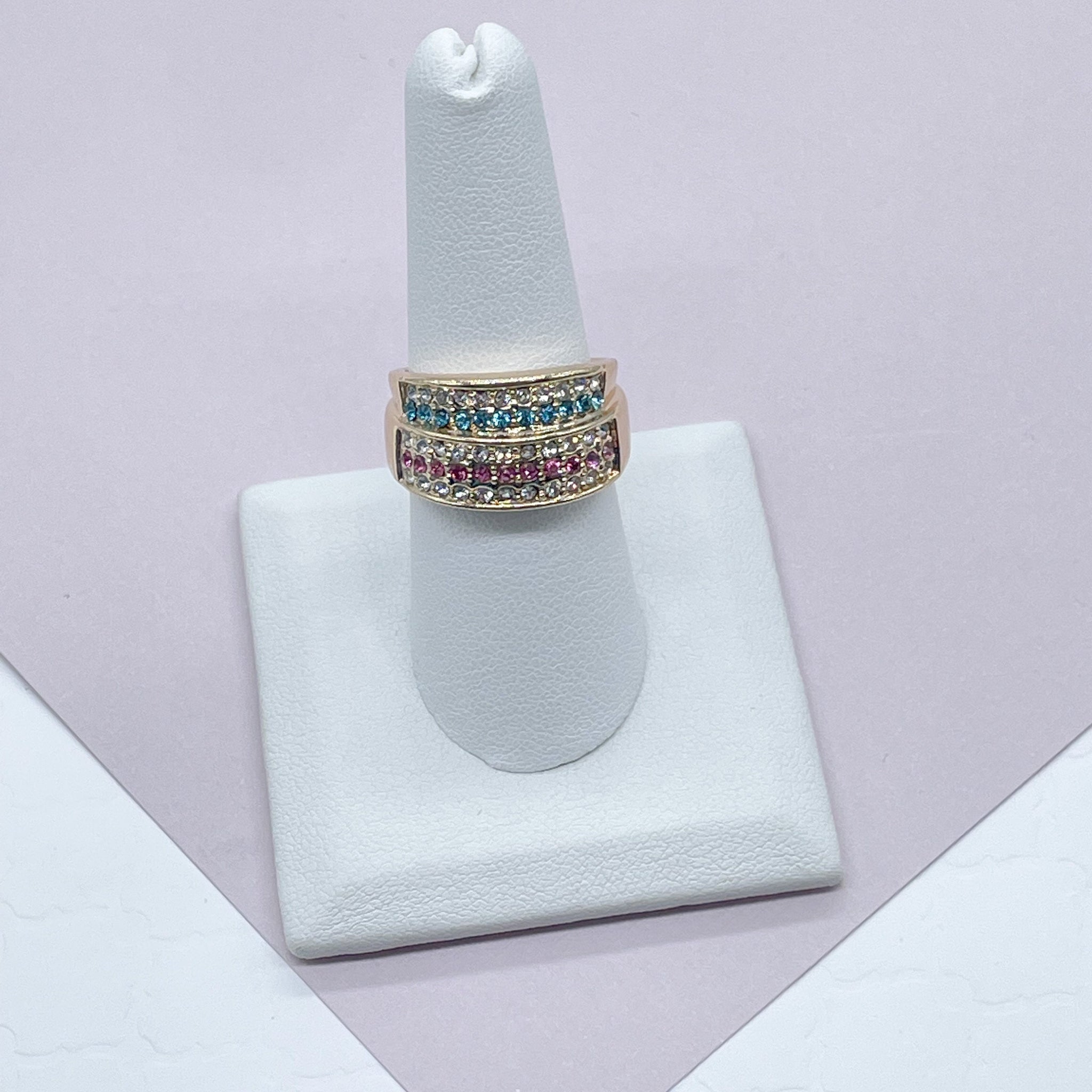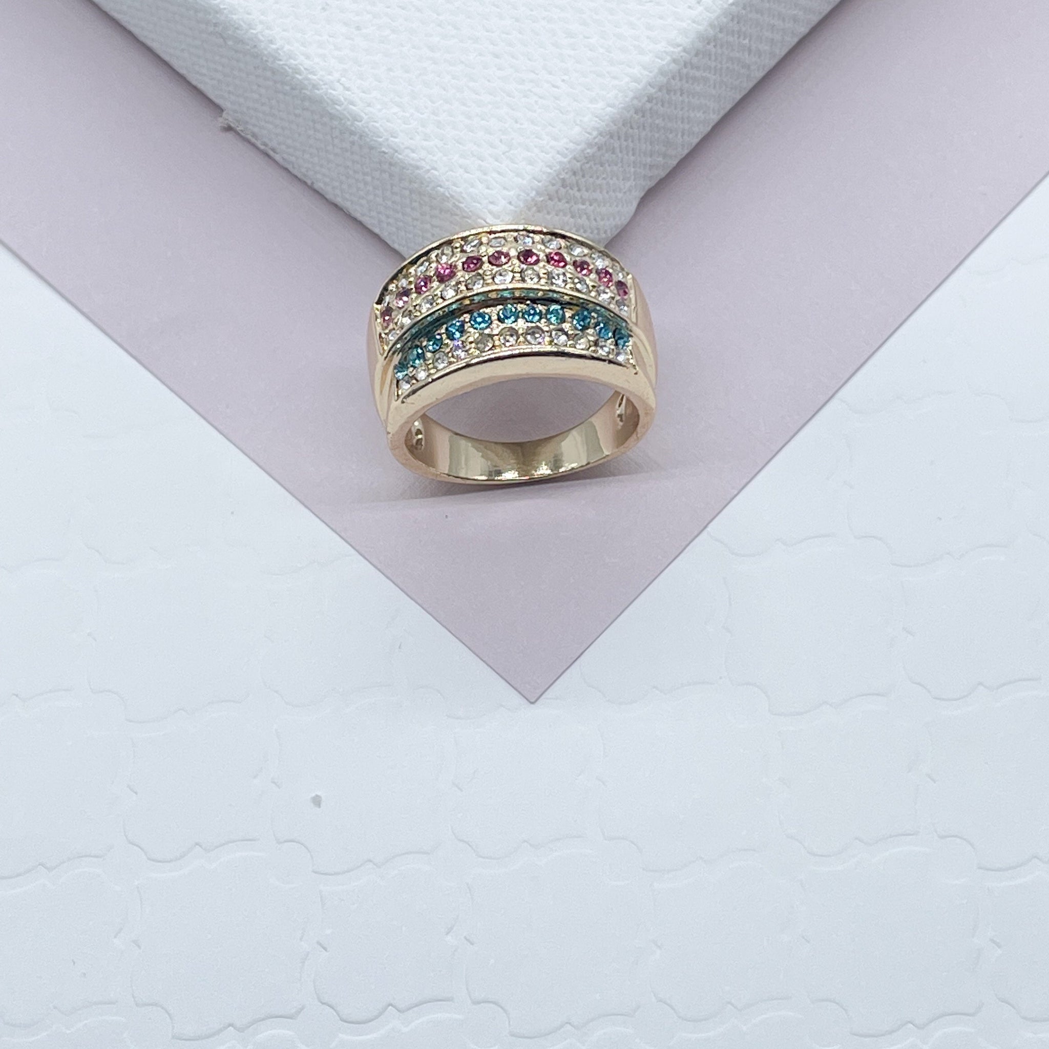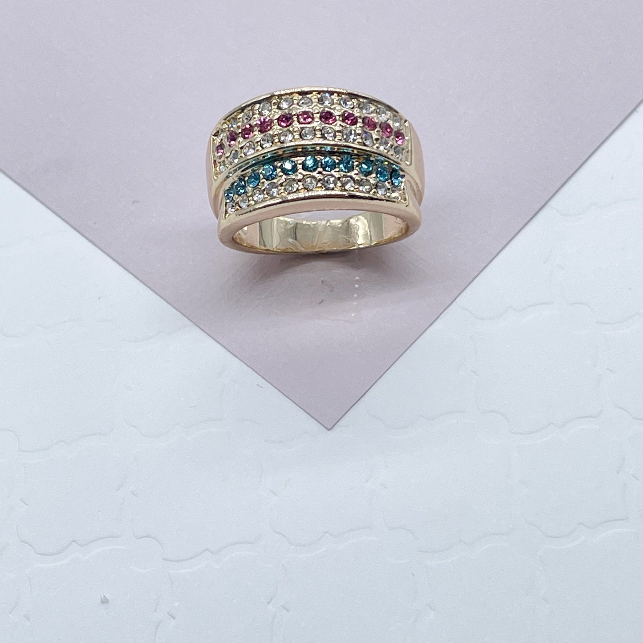 18k Gold Filled Colorful Patterned Ring Featuring Light Blue, Magenta And Clear Cubic Zirconia