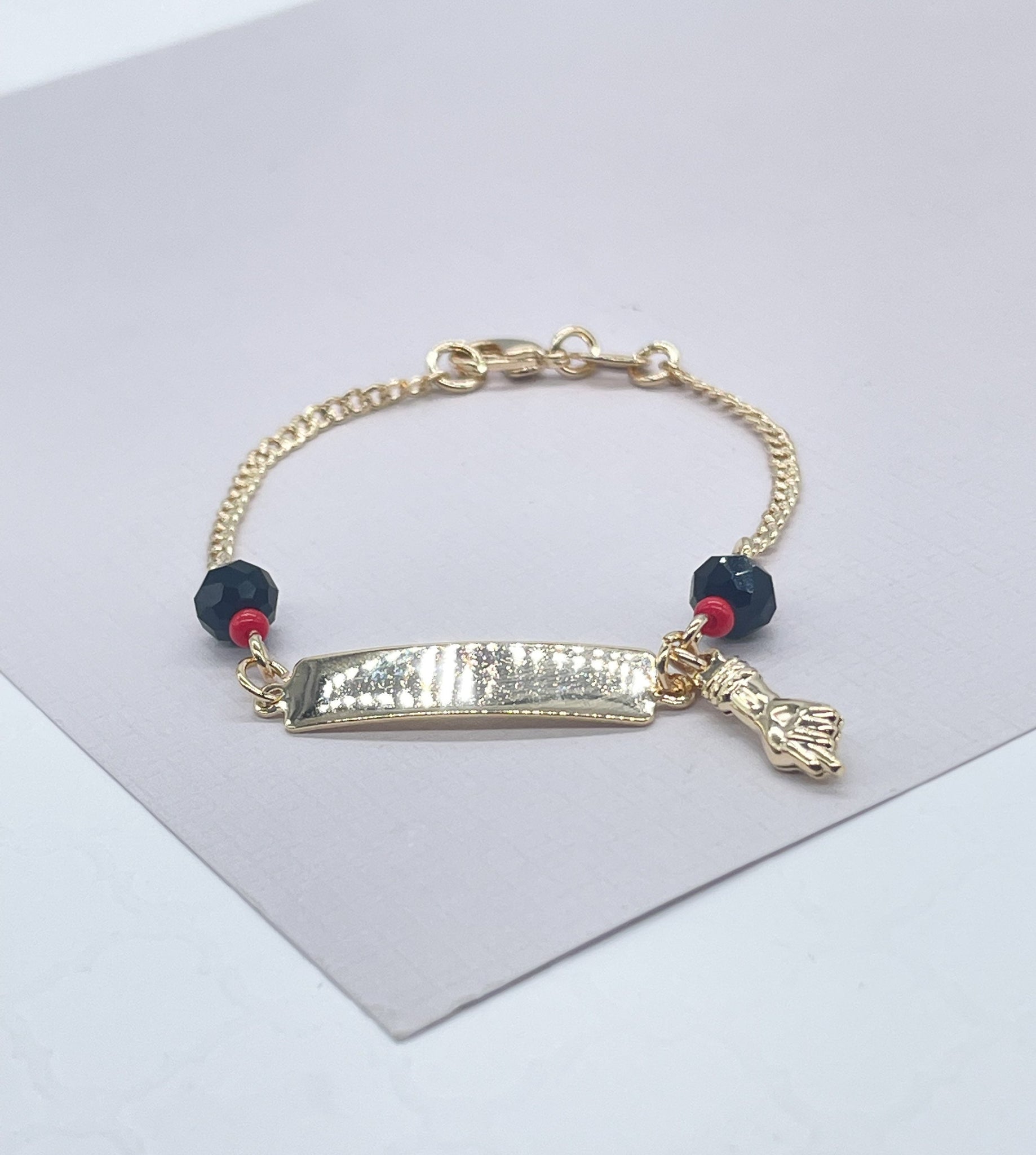 18k Gold Filled Cuban Link ID Bracelet With Azabache Charms on Two Ends & Lucky Hand Charm