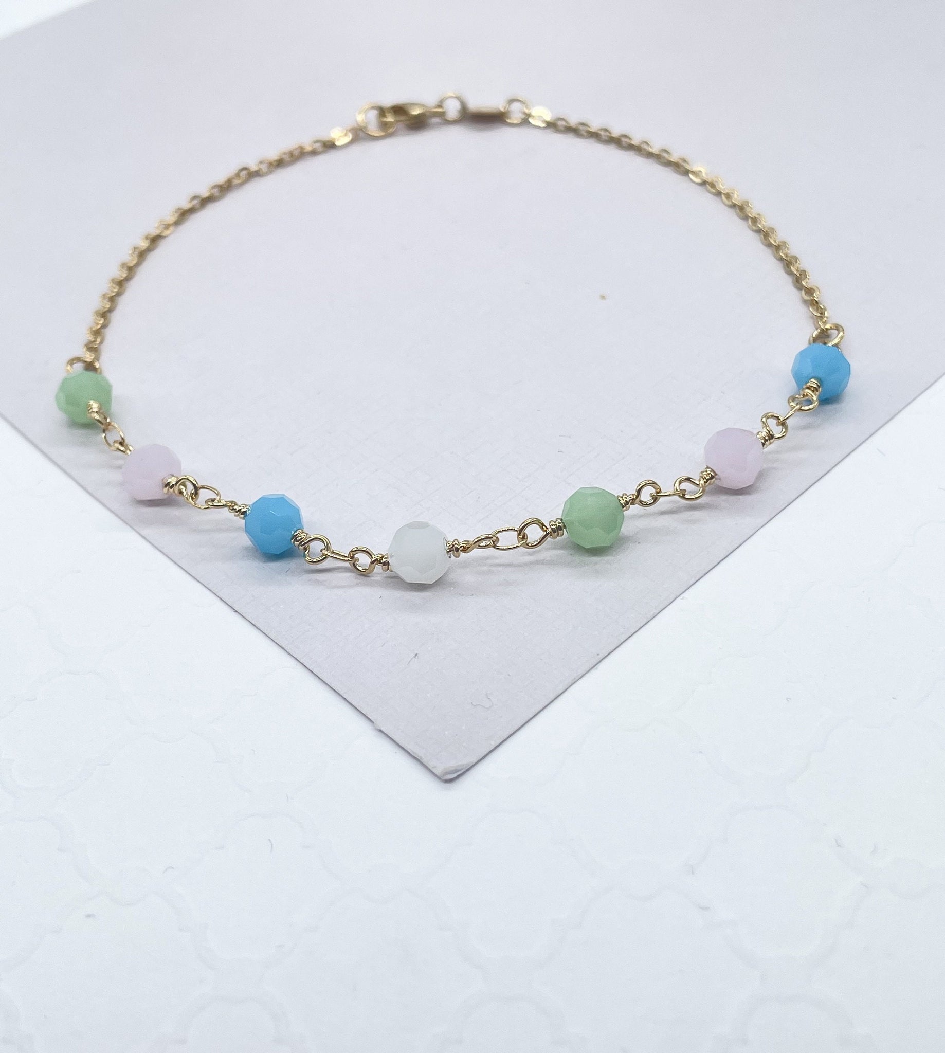 18k Gold Filled Curb Link Anklet With Multi-Colored Beads