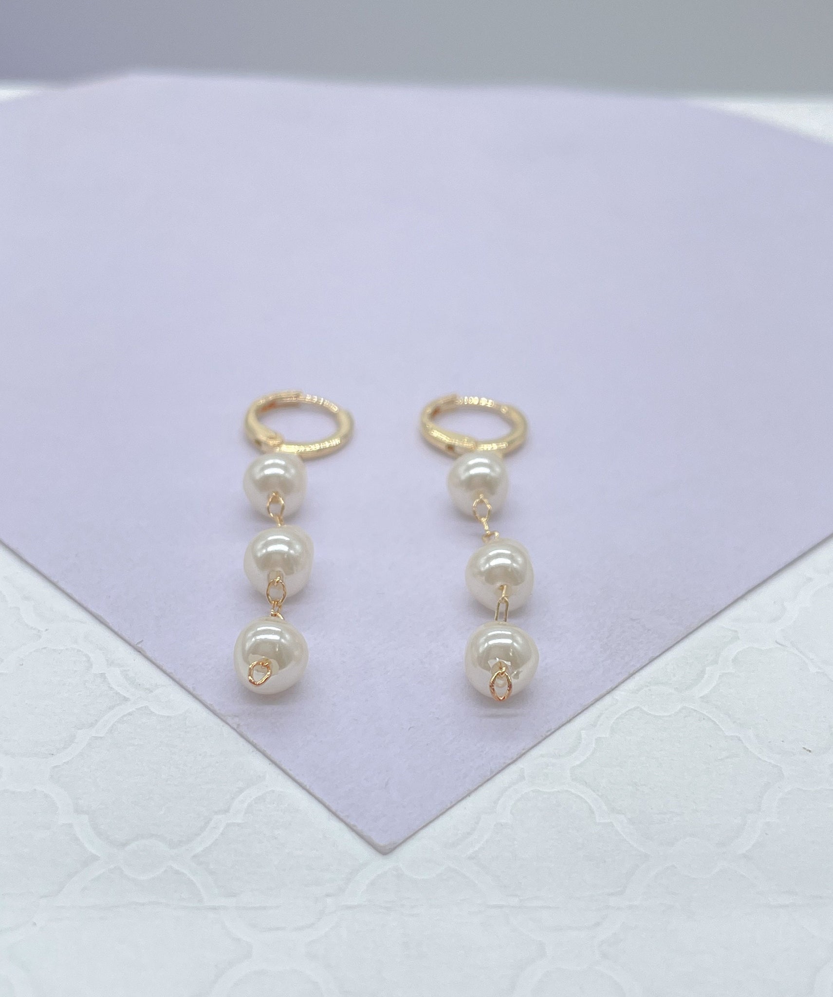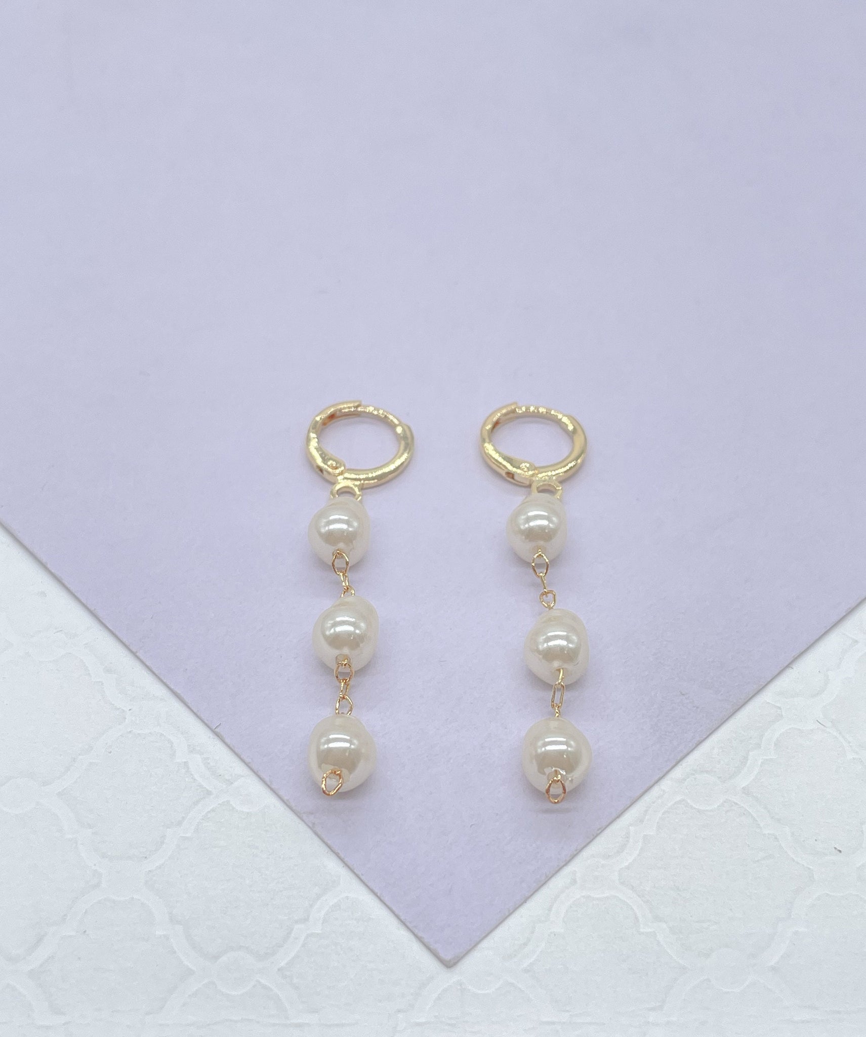 18k Gold Filled Dainty Hoops With 3 Small Faux Pearl Charms