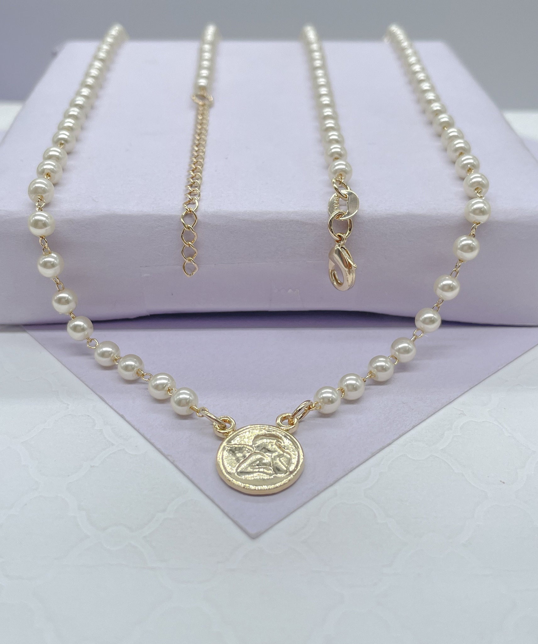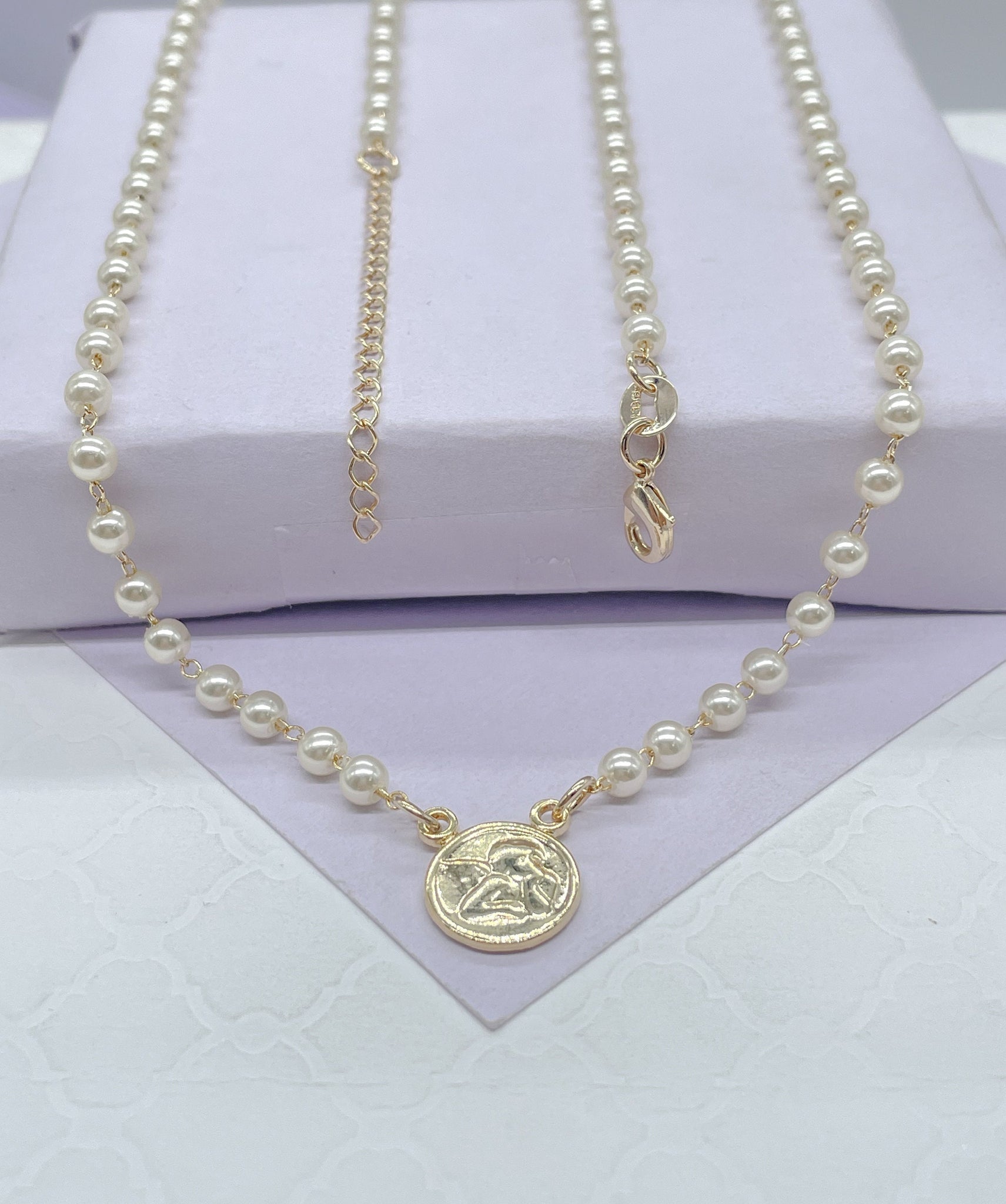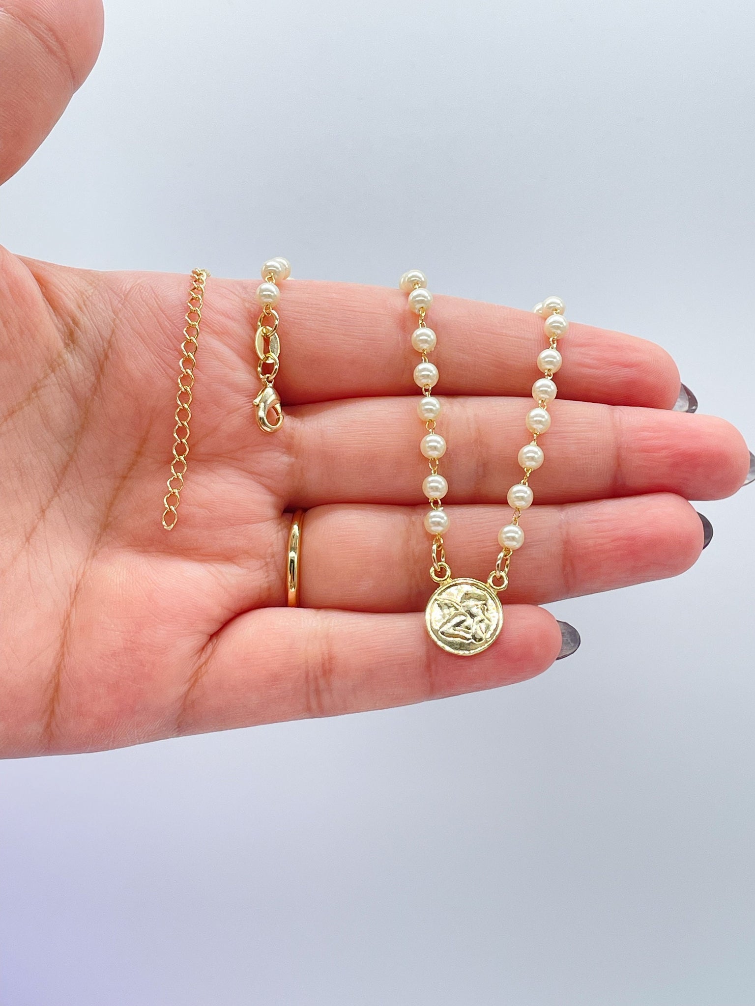 18k Gold Filled Dainty Pearl Choker with Angle Medallion Center Piece Choker