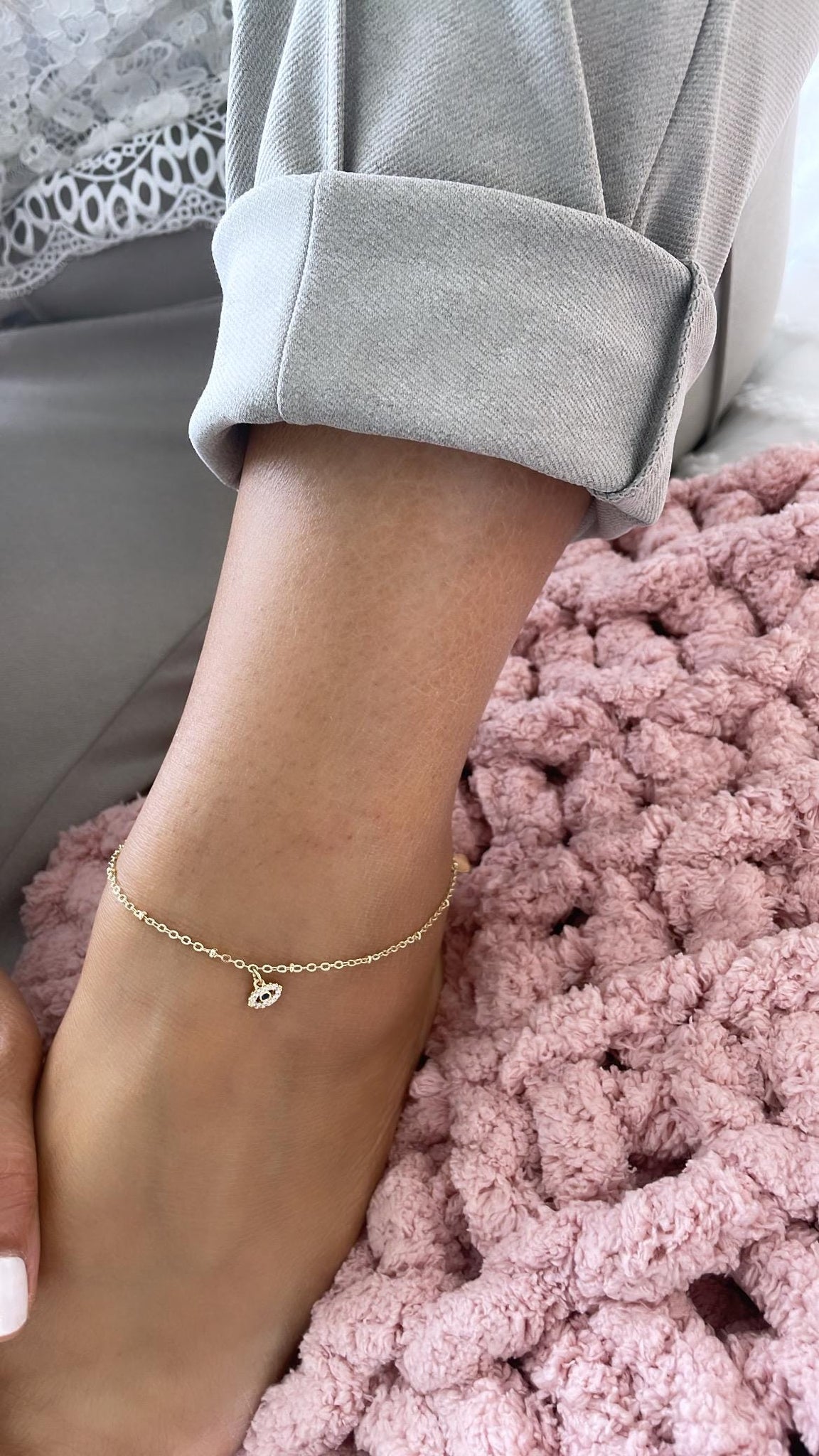 18k Gold Filled Dainty Satellite Anklet featuring Blue Evil Eye Charm, Protection Jewelry