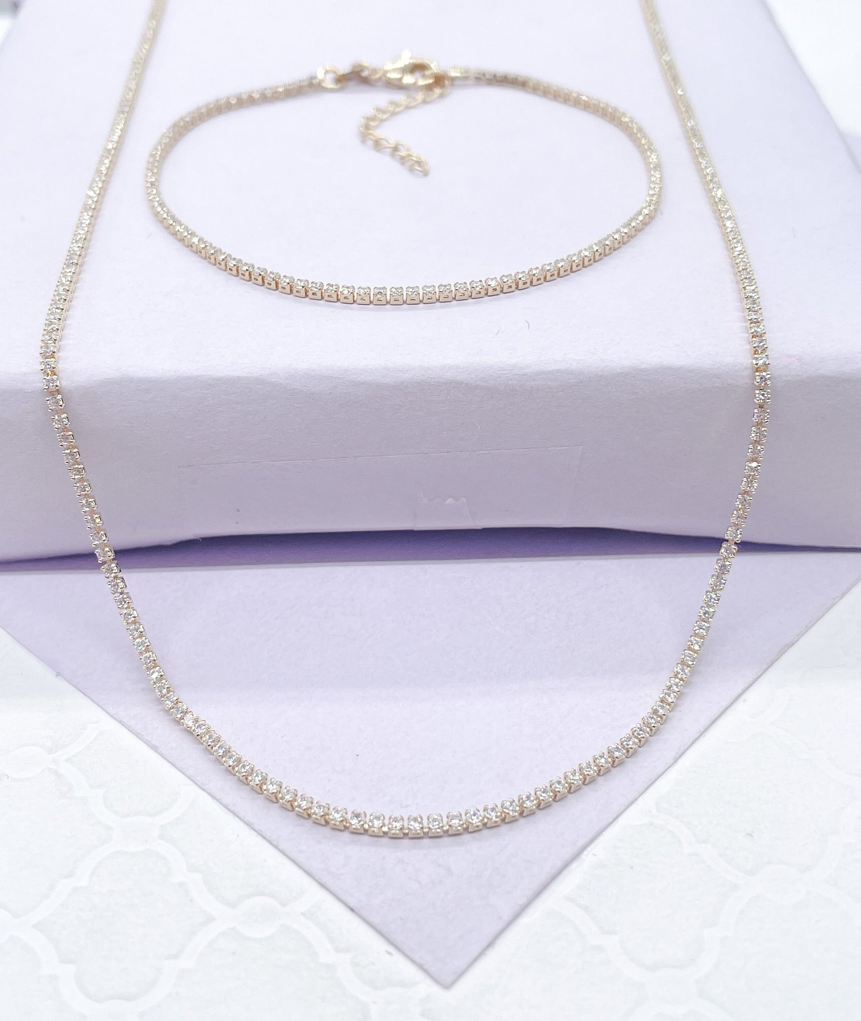 18k Gold Filled Dainty Ultra-Thin Layering Tennis Chain Bracelet & Choker Set