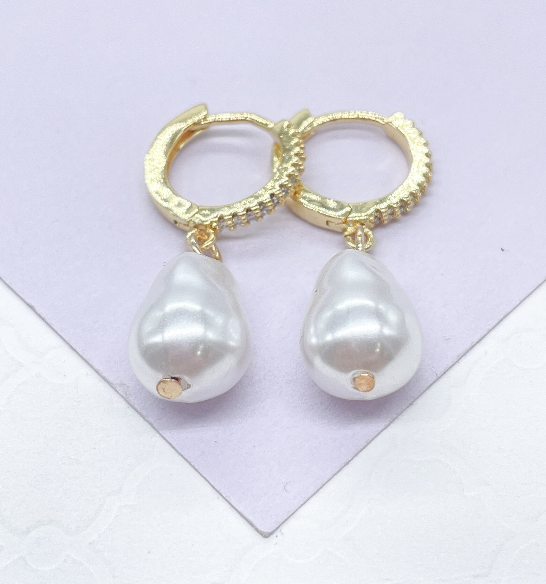 18k Gold Filled Dangling Baroque Pearl With Pave Hoop Earring