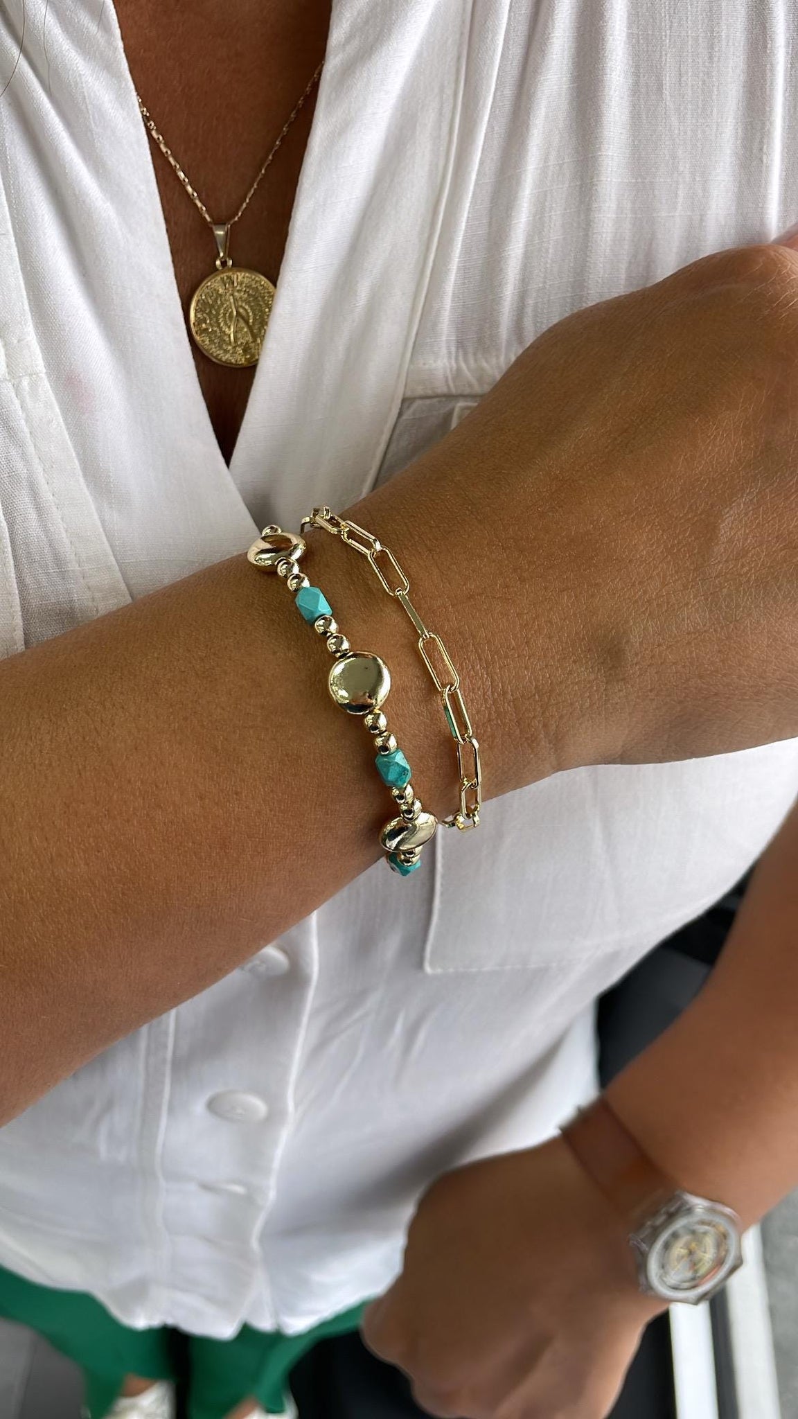 18k Gold Filled Double Bracelet with Paper Clip Link and Beaded Turquoise Stones