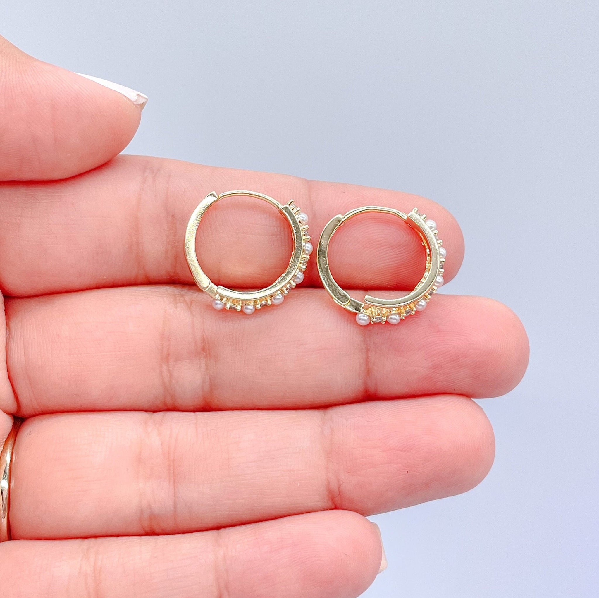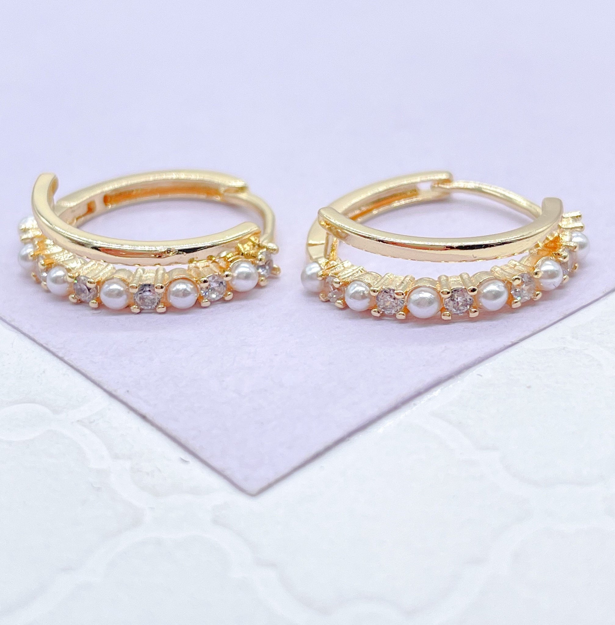 18k Gold Filled Double Rowed Hoop Earring With Pearl and CZ & Plain Smooth Rows