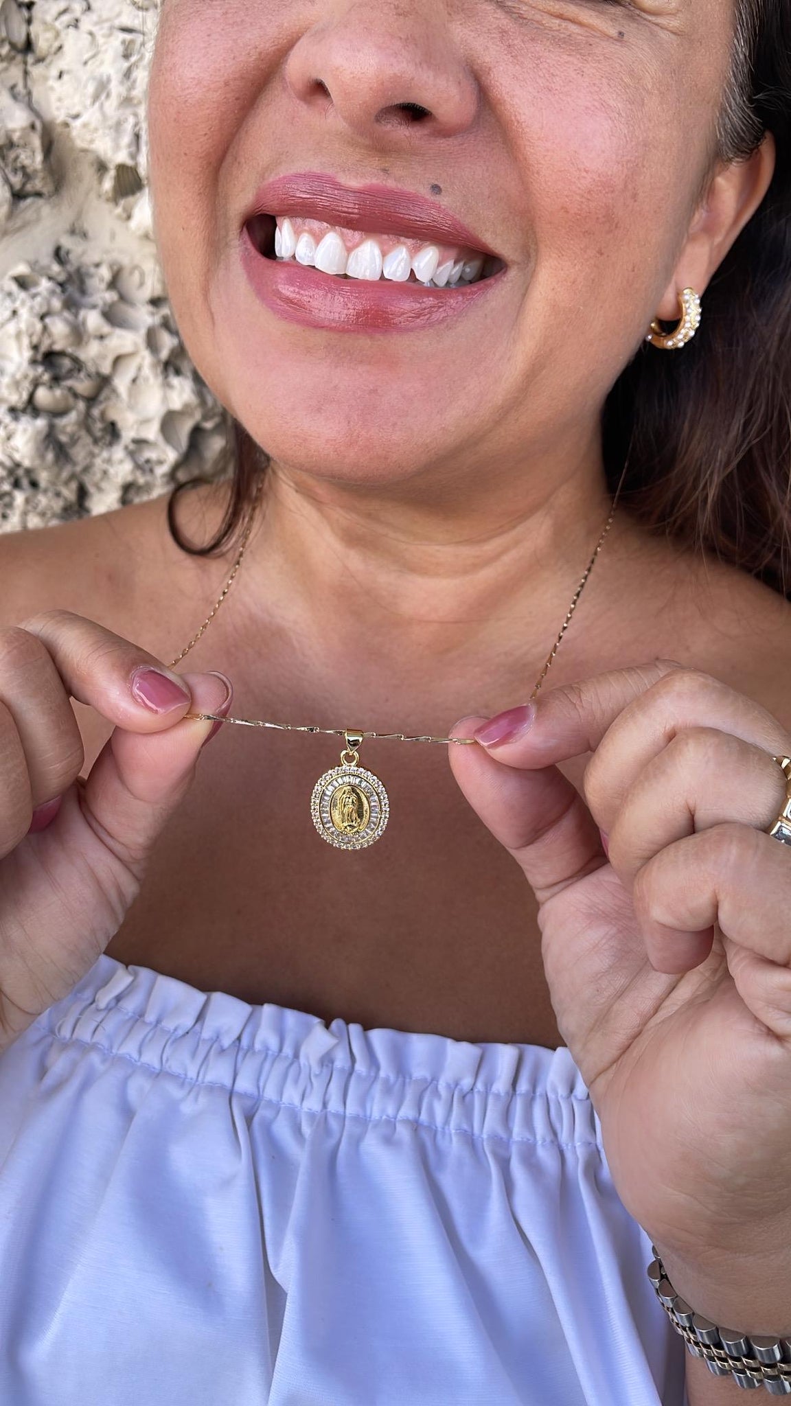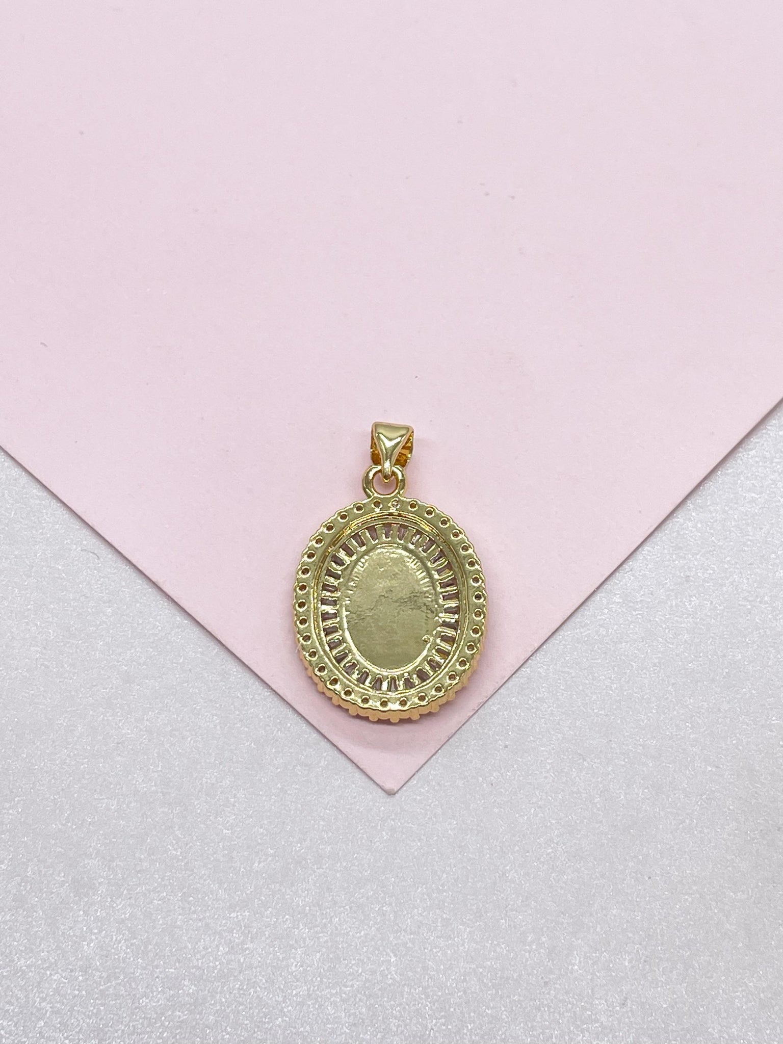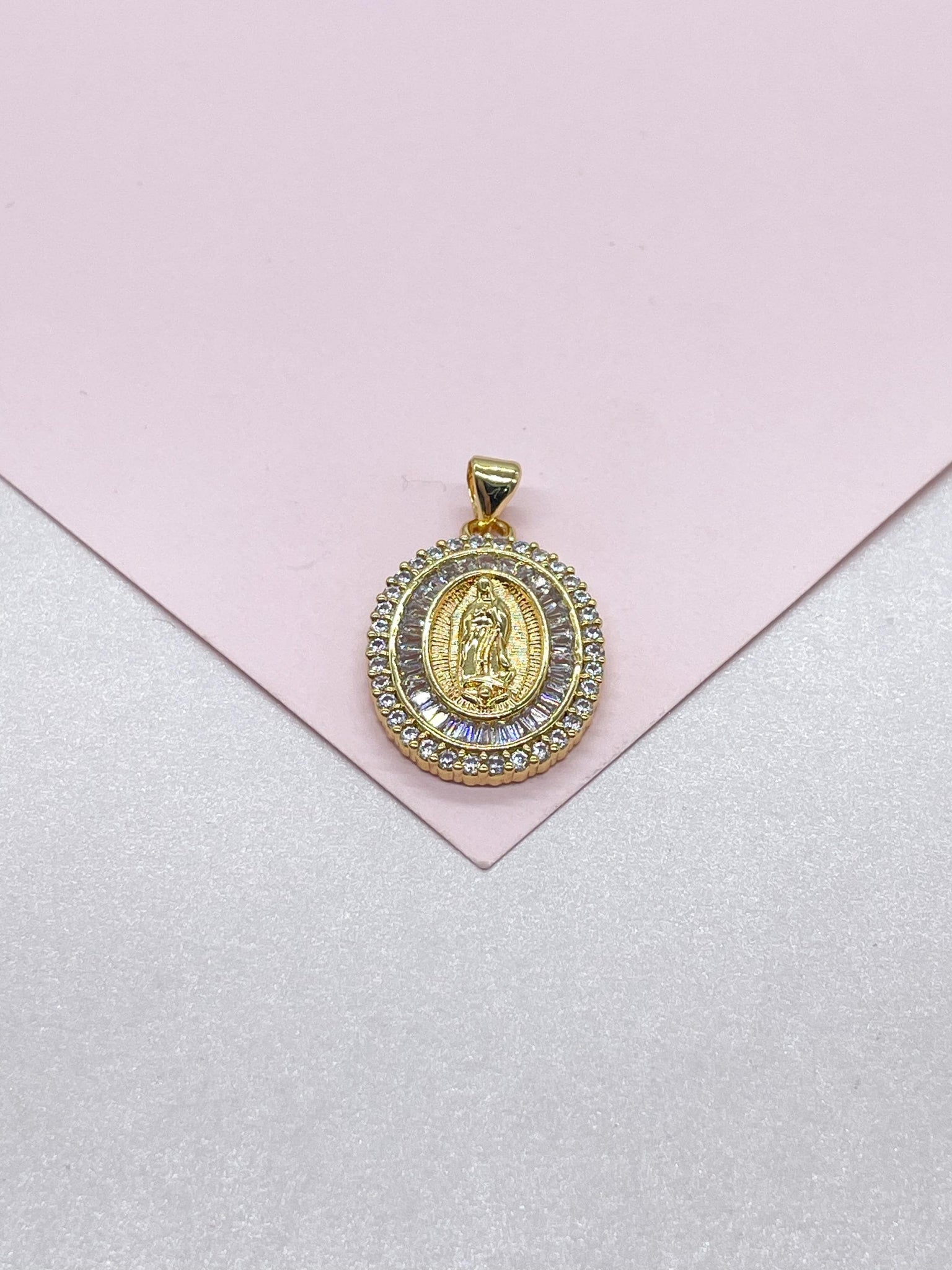 18k Gold Filled Engraved Virgin of Mary Medallion with Baguette and Round CZ
