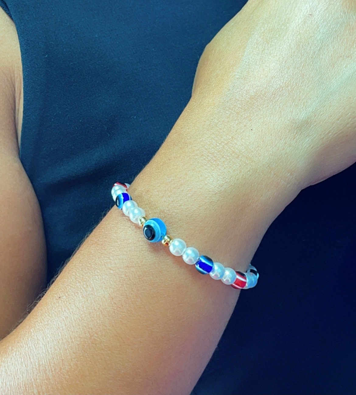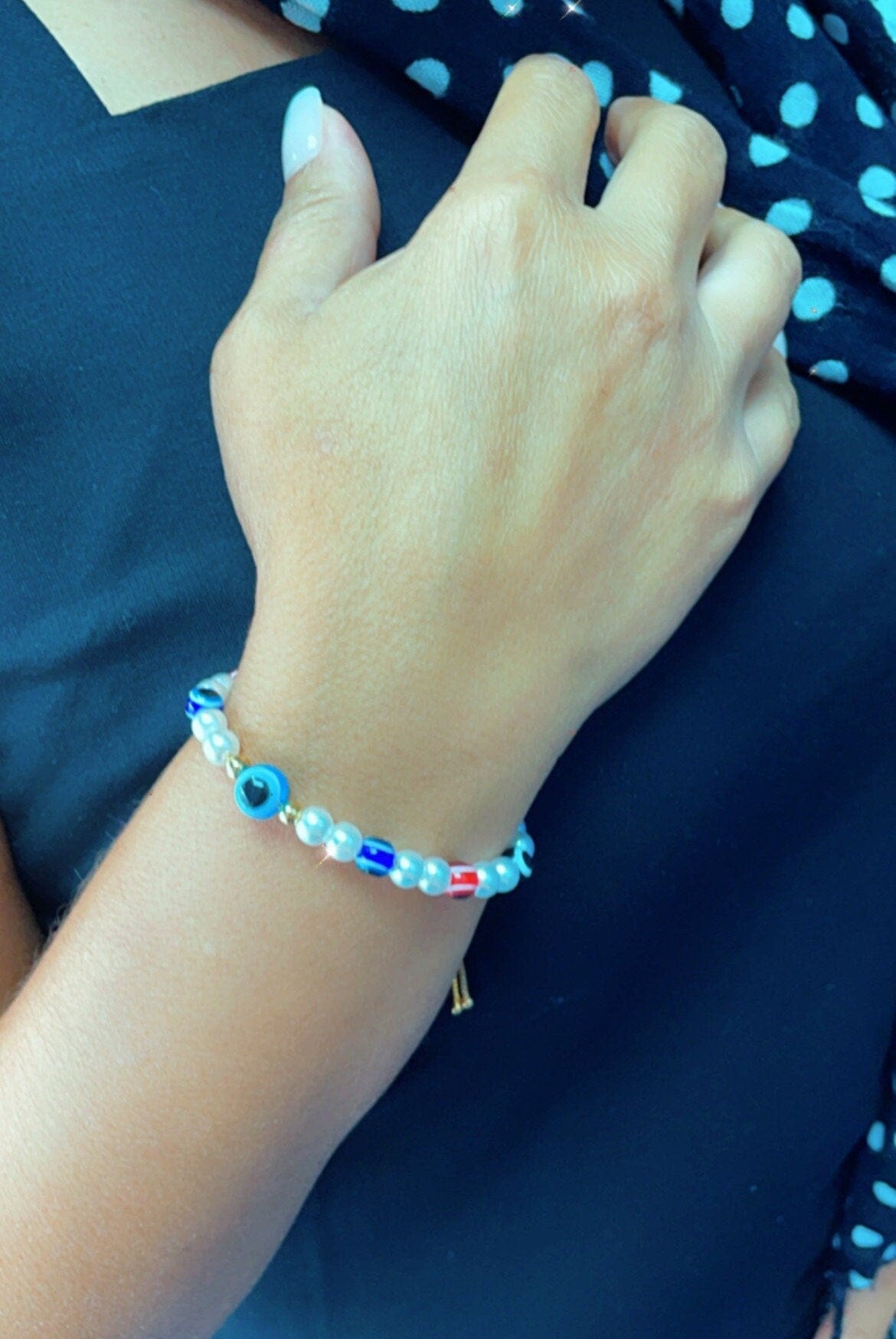 18k Gold Filled Evil Eye & Pearl Adjustable Bracelet featuring slide clasp.