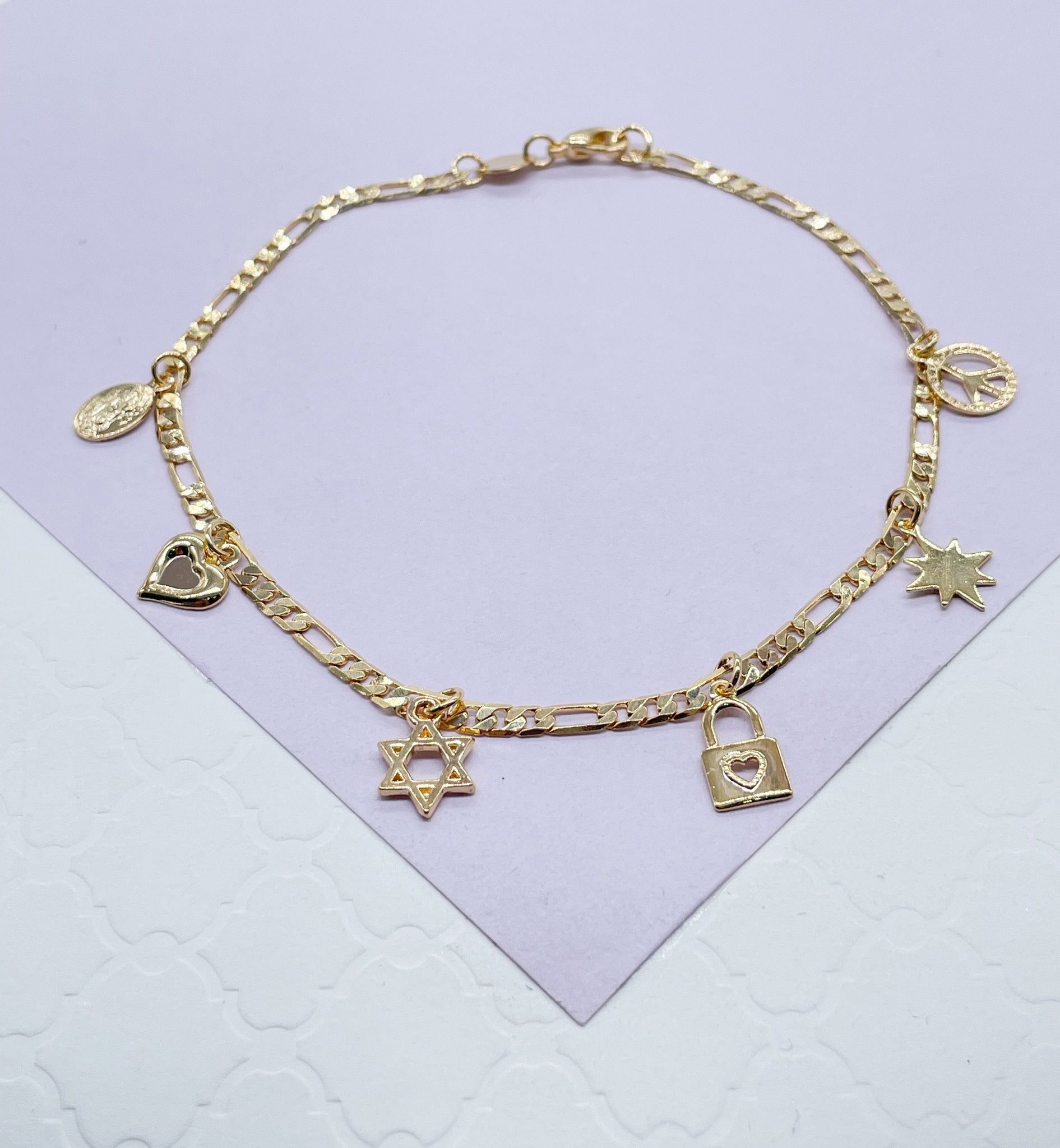 18k Gold Filled Figaro Anklet With Multiple Positive and Love Charms
