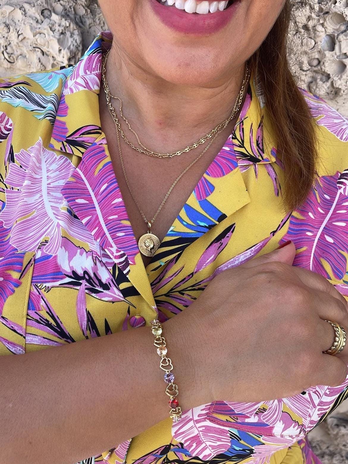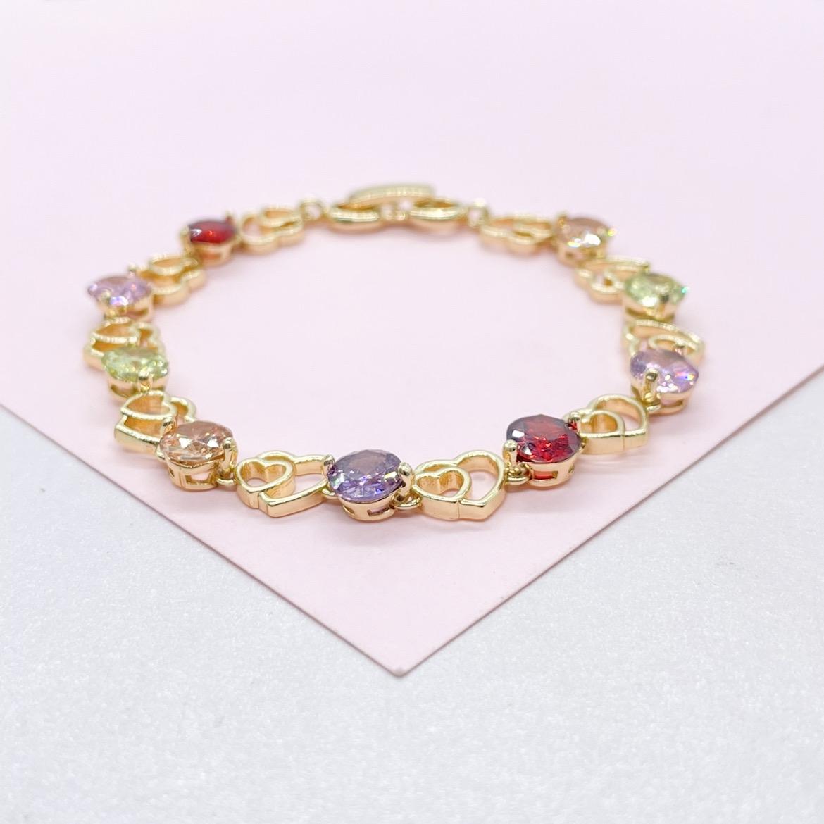 18k Gold Filled Heart Patterned Bracelet with Round Colorful CZ Stones