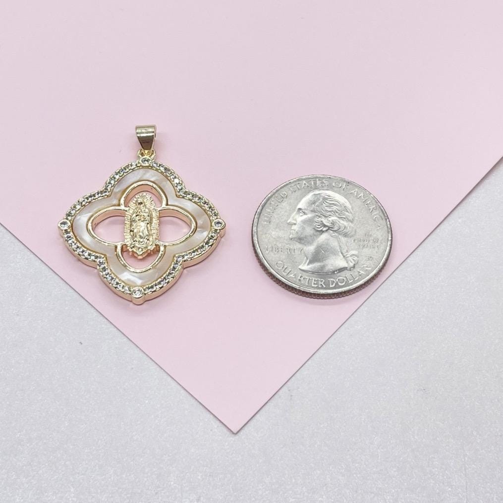 18k Gold Filled Mother of Pearl Clover Pendant with Virgin Mary Engraved Crowned with CZ