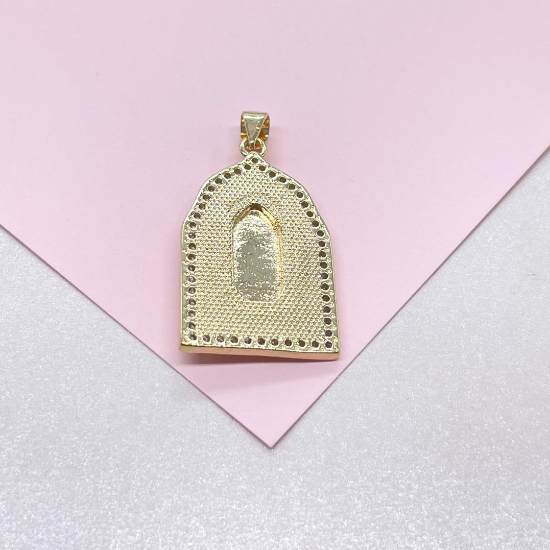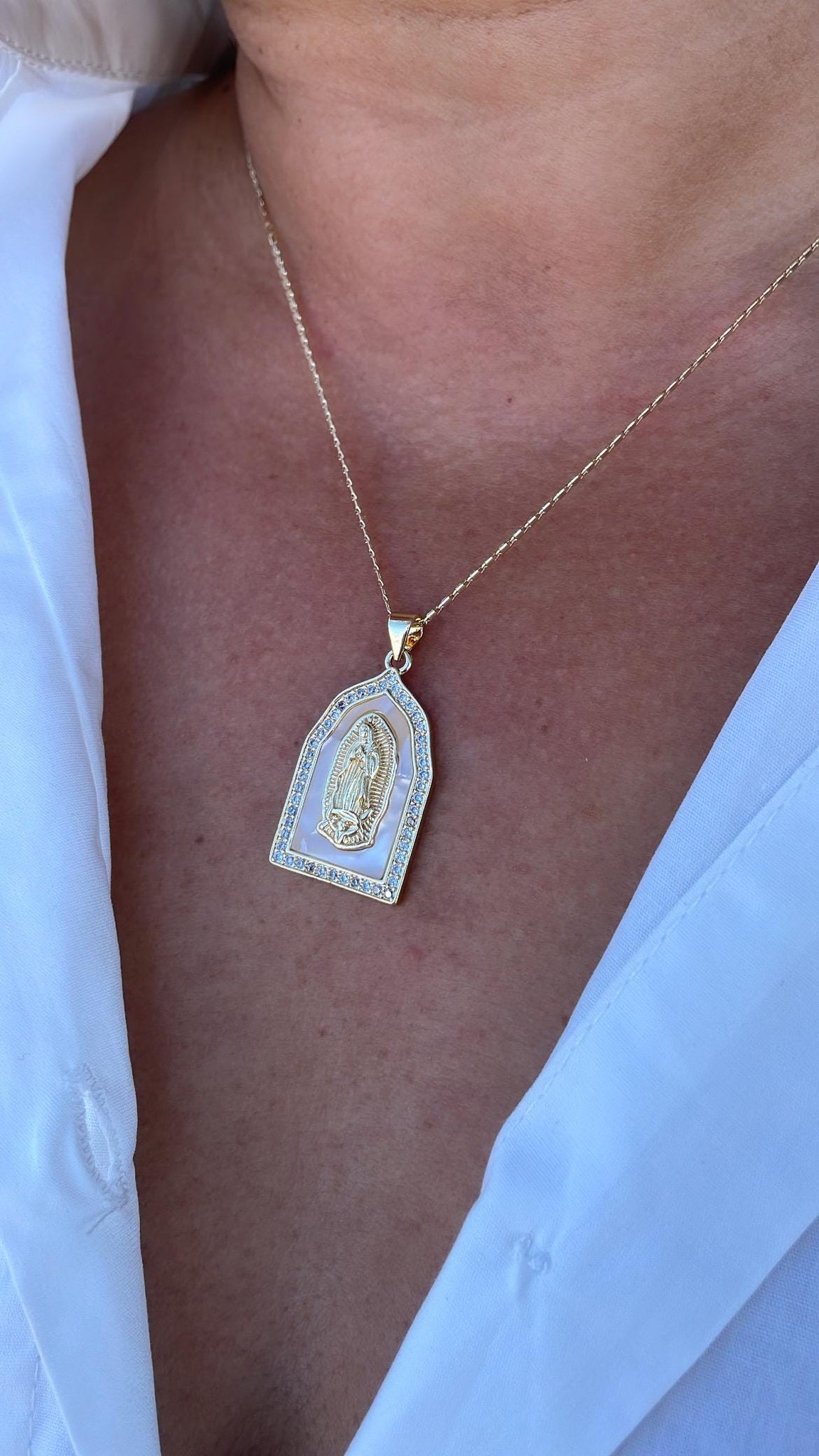18k Gold Filled Mother of Pearl Rectangle Medallion Engraved with Virgin Mary & CZ