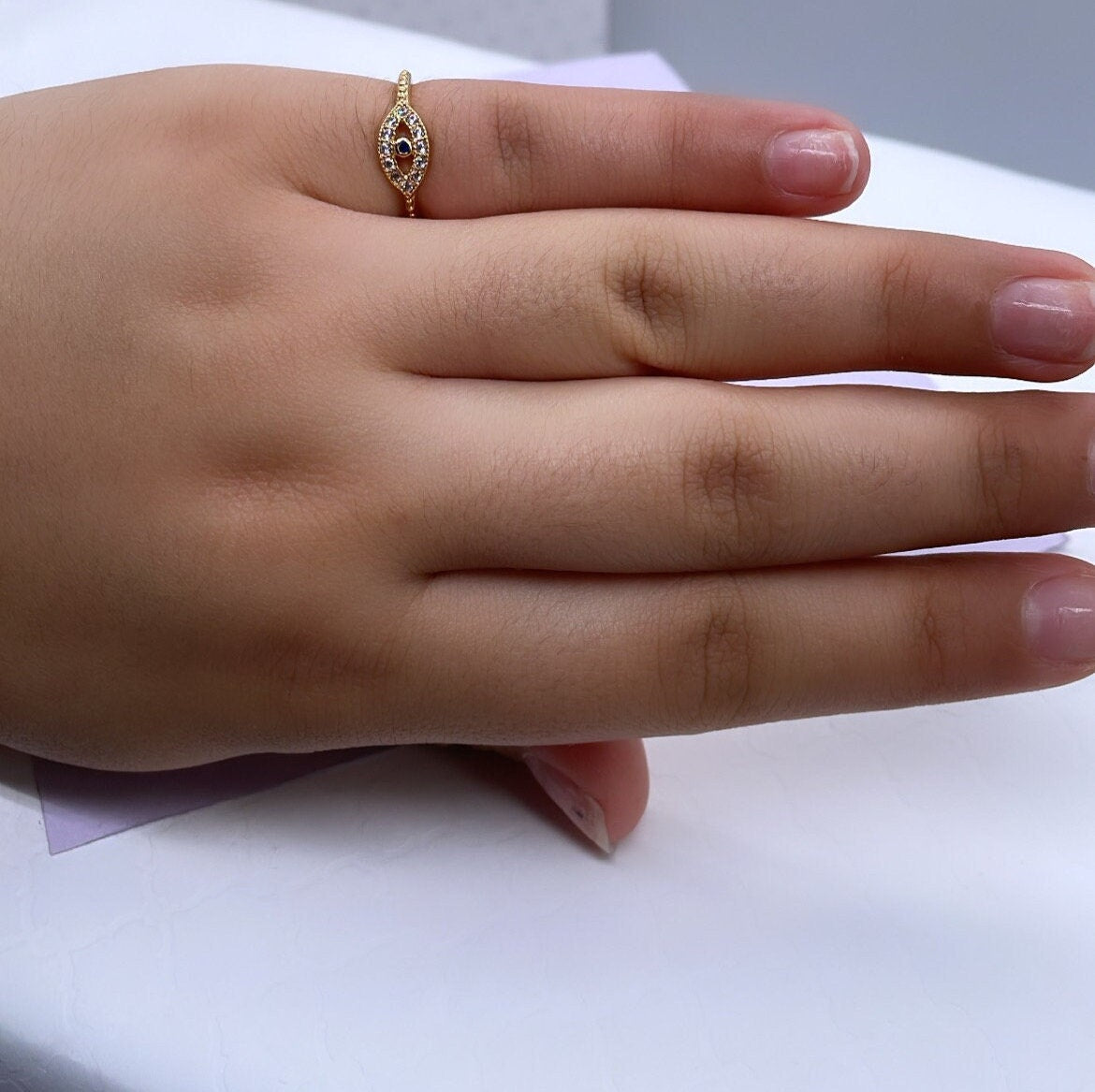 18k Gold Filled Pave Evil Eye Ring With Blue Stone Center