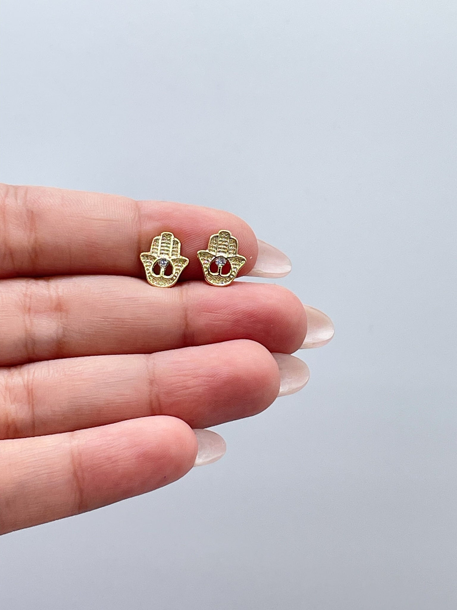 18k Gold Filled Plain Textured Hamsa Hand Stud Earring With Heart Center & CZ Center