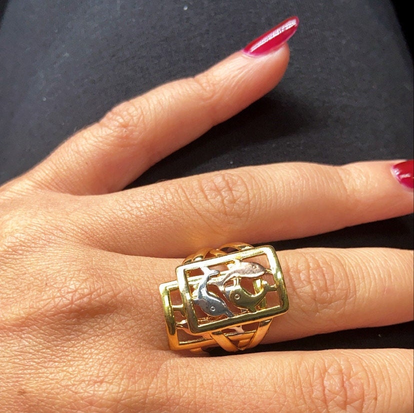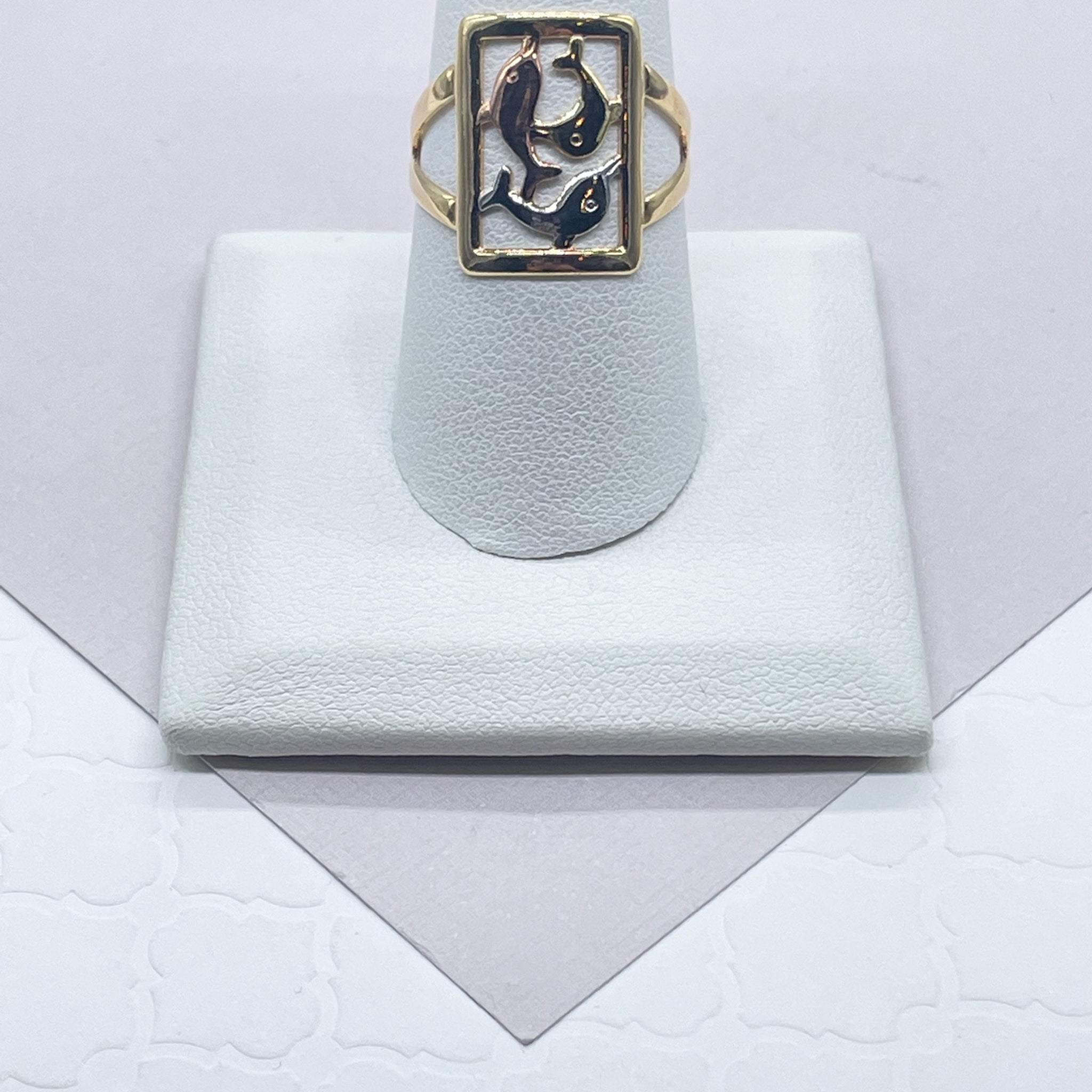 "Transform your style with our 18k Gold Filled Chunky CZ Eternity Band Ring. Designed to create the most exquisite and luxurious stack, this ring adds a touch of glamour to any outfit. Elevate your look and make a statement with our stunning rings."18k Gold Filled Ring With Tri-Colored Dolphins