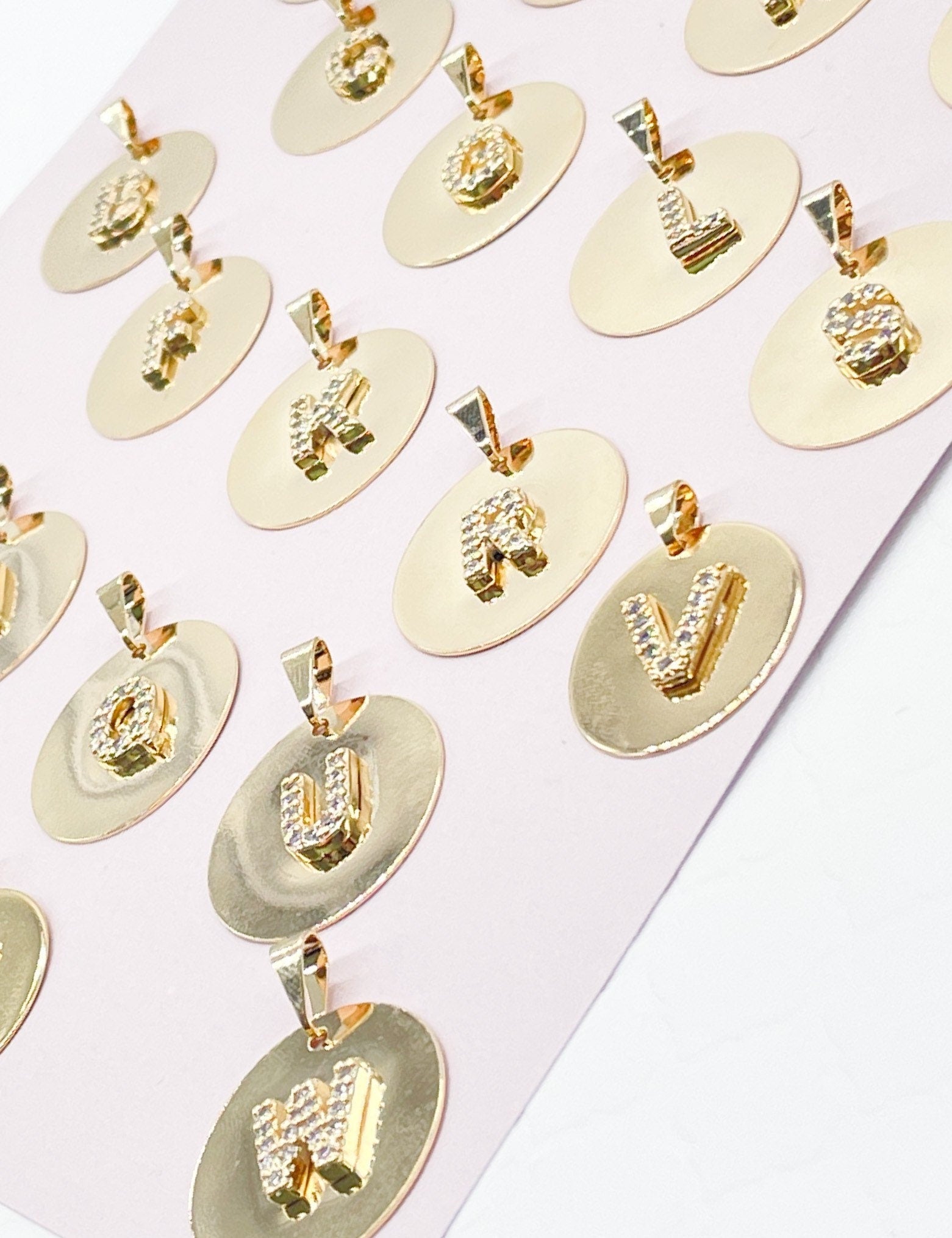 18k Gold Filled Round Initial Charm with Micro Pave Zirconia Letters.