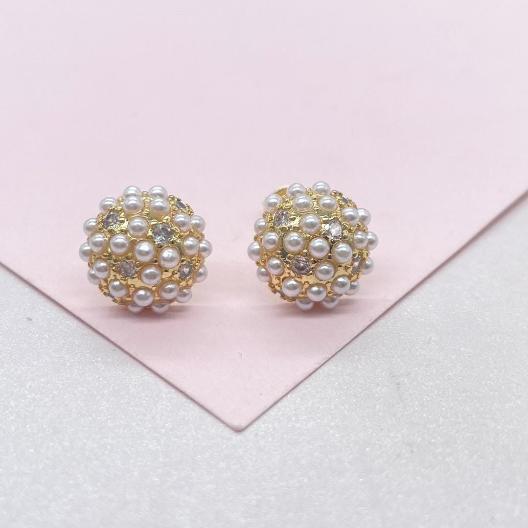 18k Gold Filled Small Pearl Beaded Cz Stud Earrings