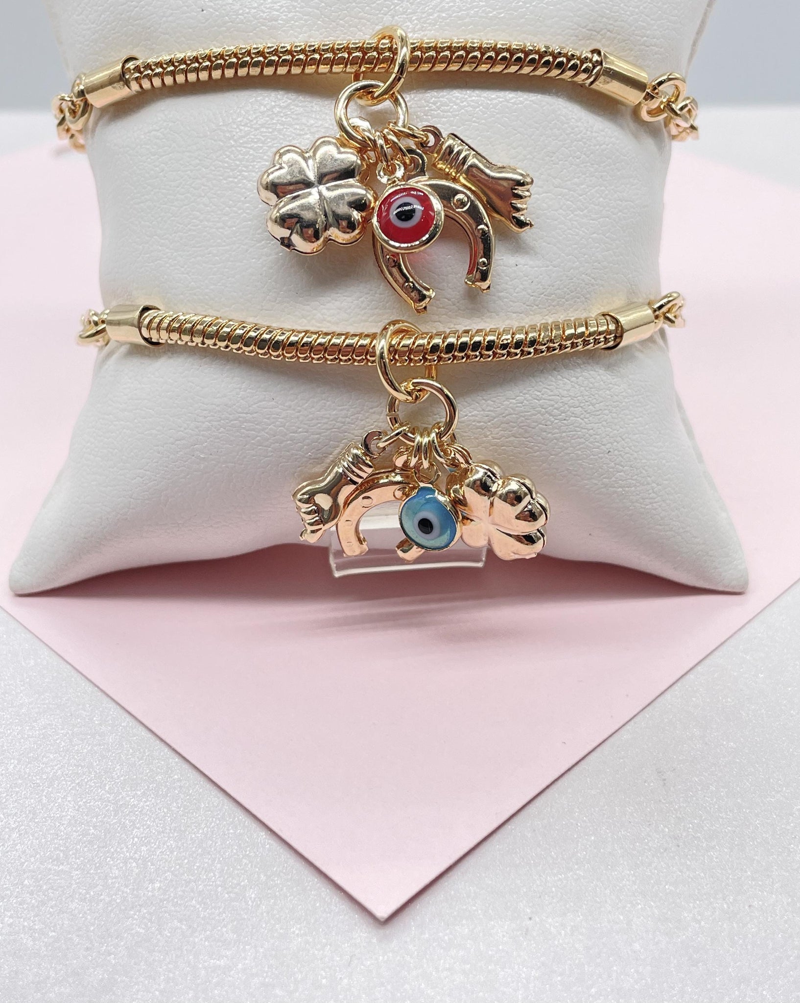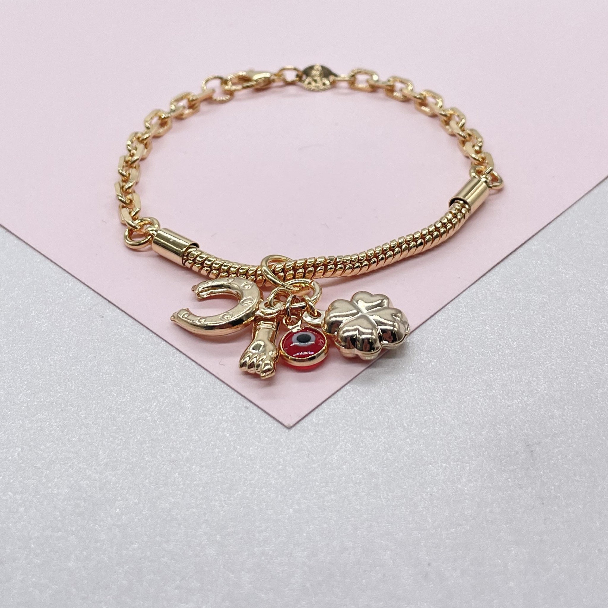 18k Gold Filled Snake and Curb Link Bracelet with Lucky Charm Bundle Available in 2 Colors