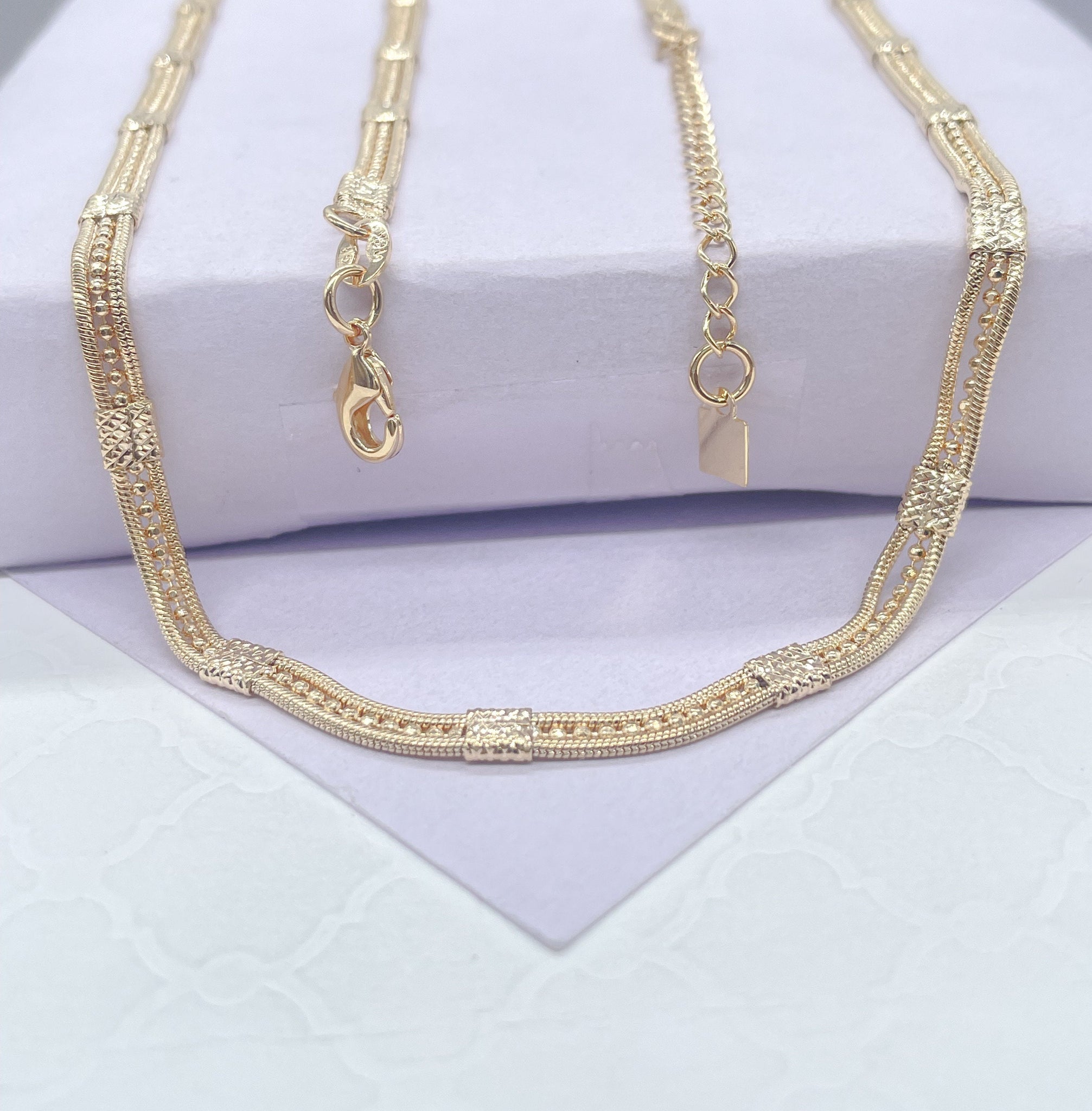 18k Gold Filled Specialty Chain, 3 in 1 Interspeed Choker Necklace, consists of two Snake Link Chains with Beaded Chain Soldered between