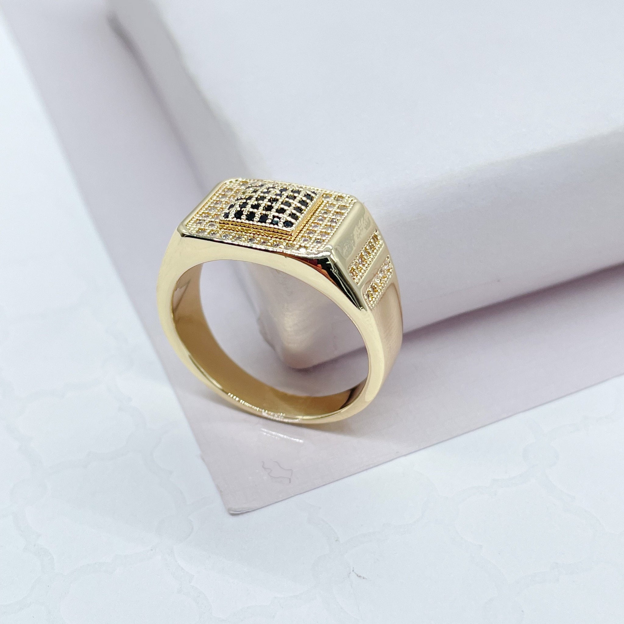"Transform your style with our 18k Gold Filled Chunky CZ Eternity Band Ring. Designed to create the most exquisite and luxurious stack, this ring adds a touch of glamour to any outfit. Elevate your look and make a statement with our stunning rings."18k Gold Filled Square Shaped Ring Layered With Small Black Pave Square