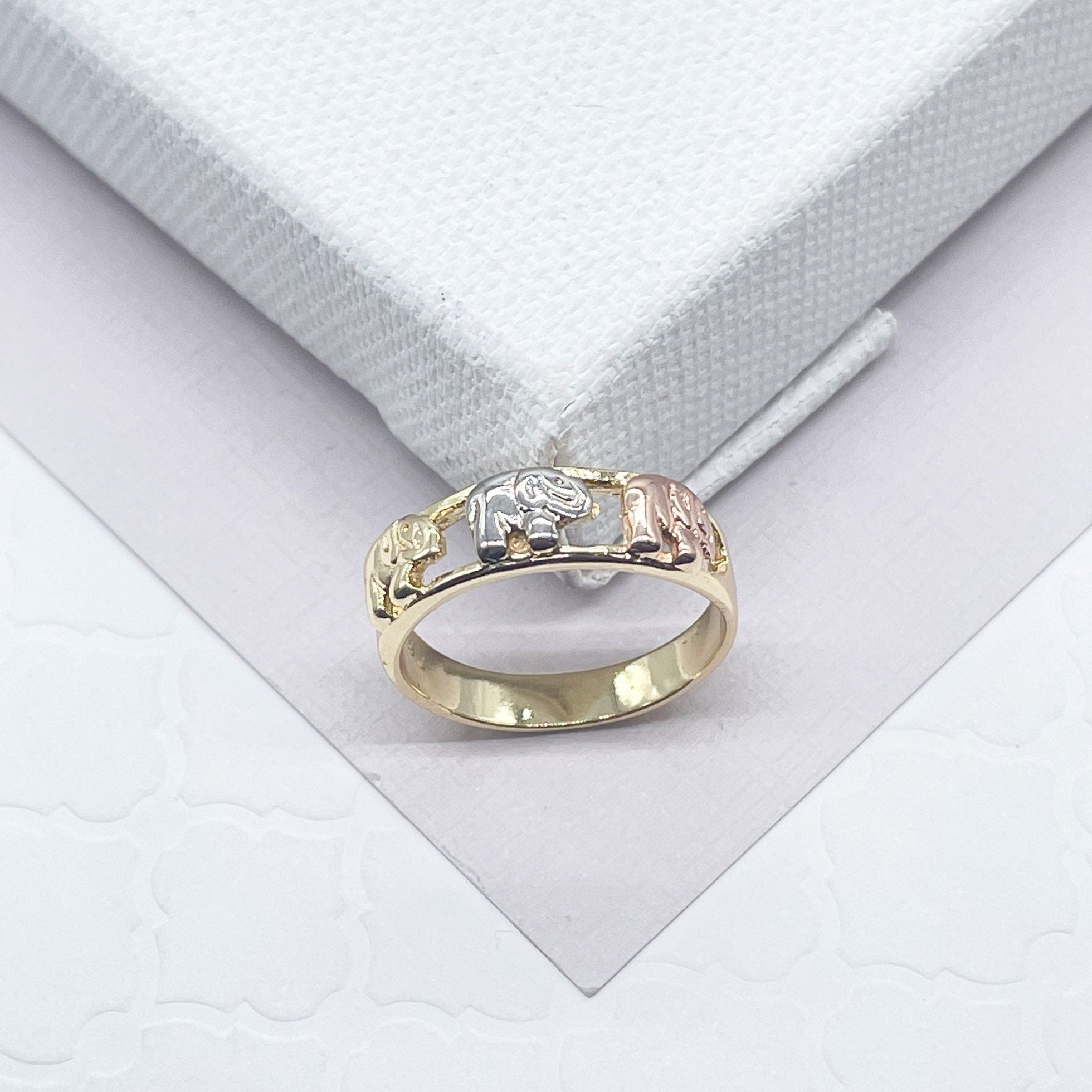 Transform your style with our 18k Gold Filled Rings. Designed to create the most exquisite and luxurious stack, this ring adds a touch of glamour to any outfit. Elevate your look and make a statement with our stunning eternity band.18k Gold Filled Tri-Color Elephant Ring