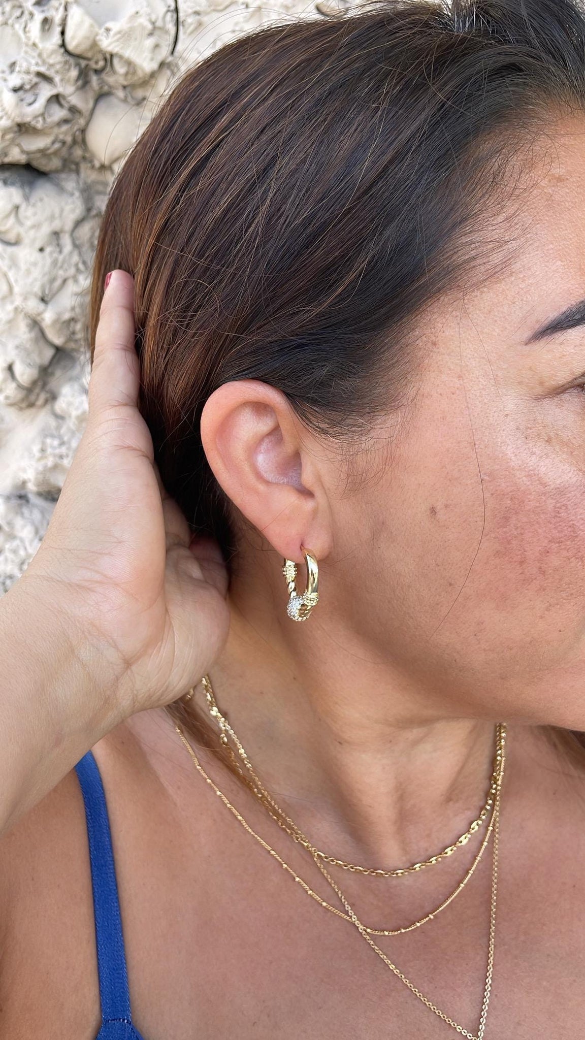 • Load image into Gallery viewer, 18k Gold Filled Triangle Hoop with Twisted and CZ Bead Ends