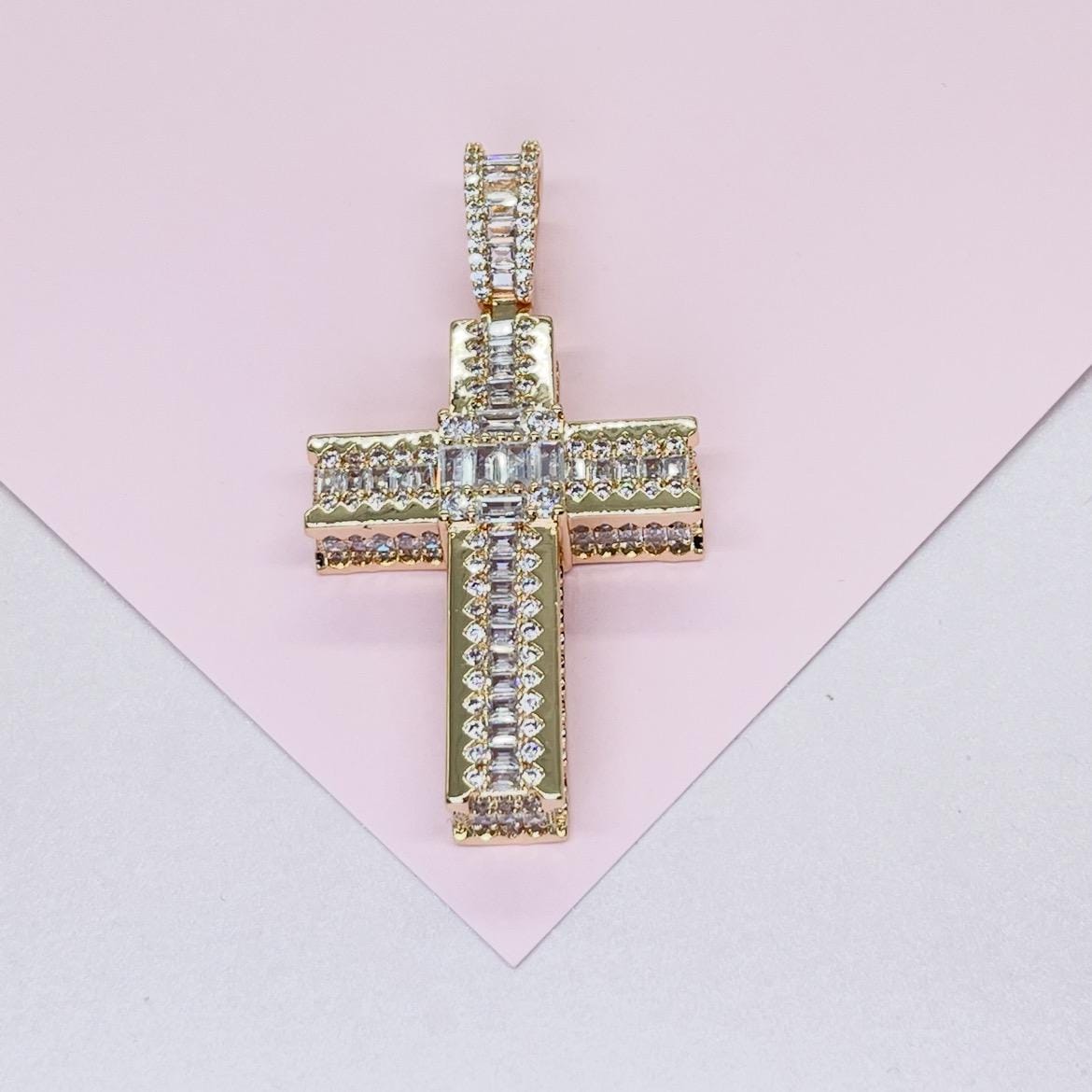 18k Gold Filled XL Crucifix Covered in Baguette cut stones, Round CZ in Prong and Beveled Setting