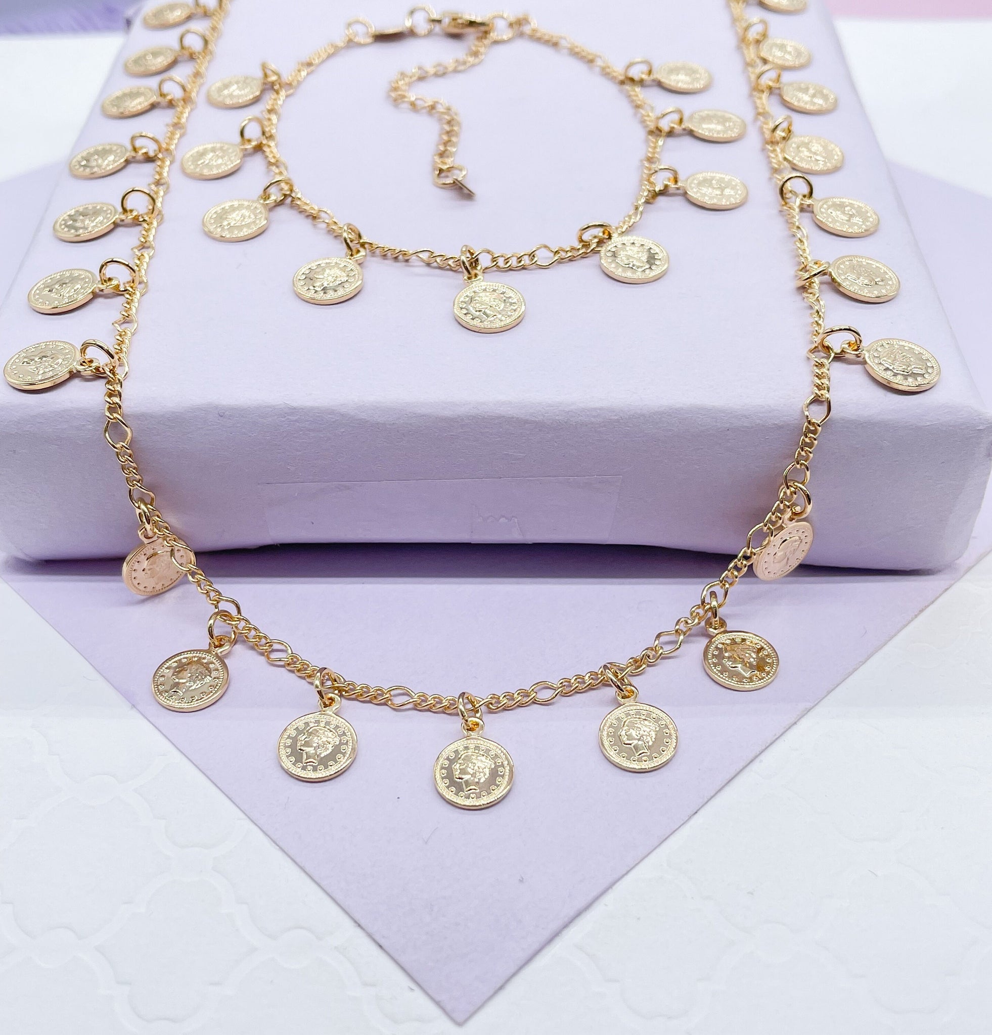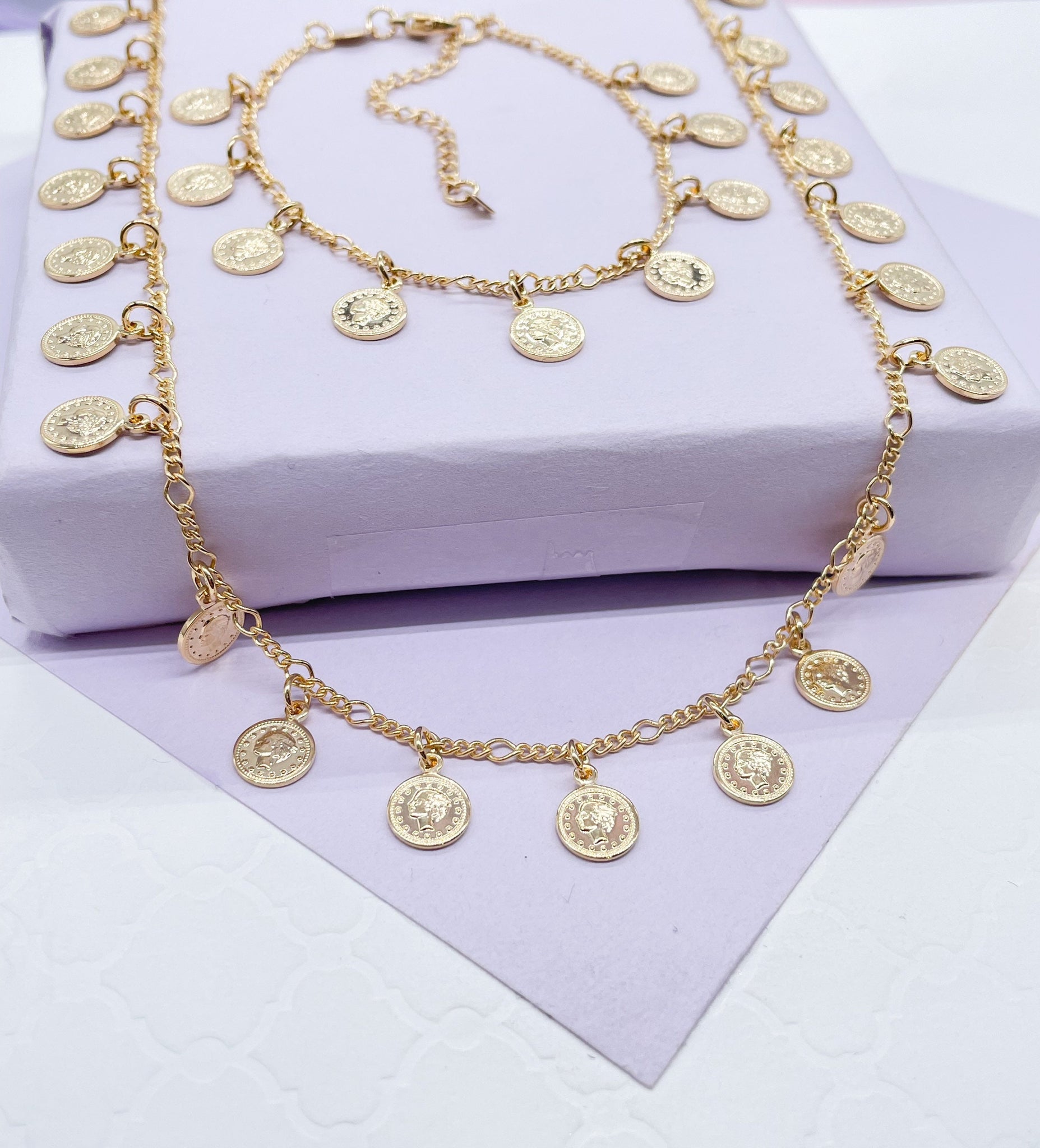 18k GoldFilled Charm Necklace And Bracelet Set With Mini Medallion Charms