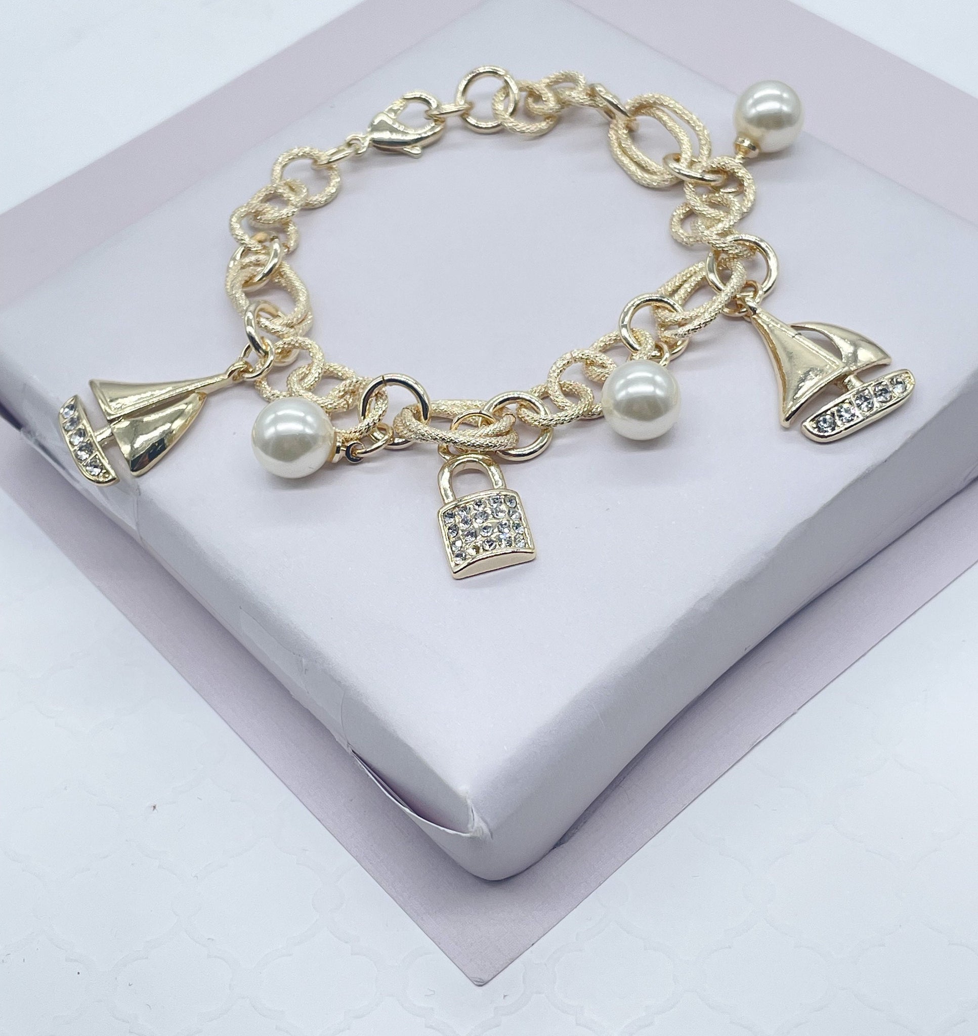 18k Hold Filled Sea Life Charm Bracelet, With Pearl Charms and Sailing Boats, Locks thick oval link bracelet