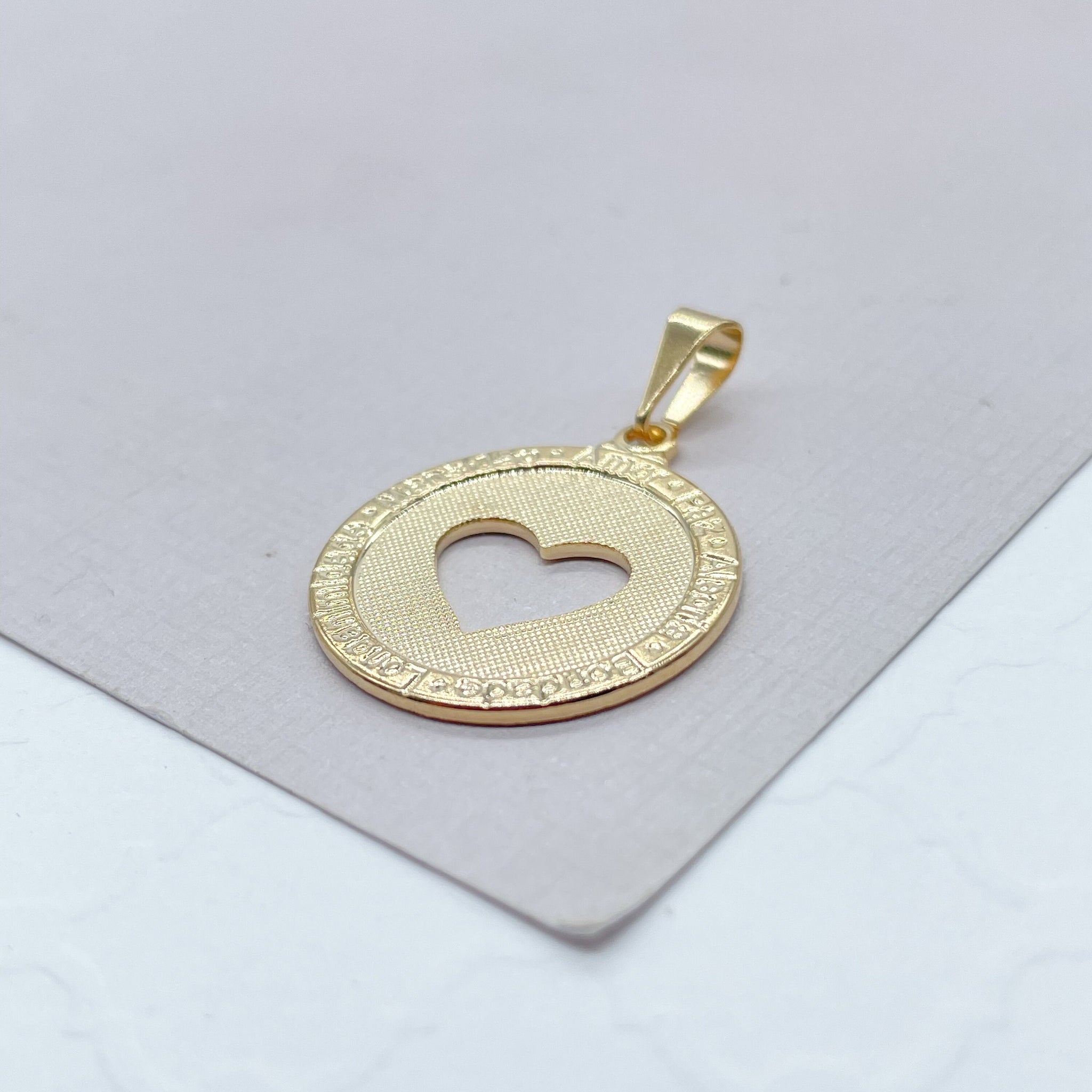18k See Through Heart Pendant With Engraved Love Words and Textured Center