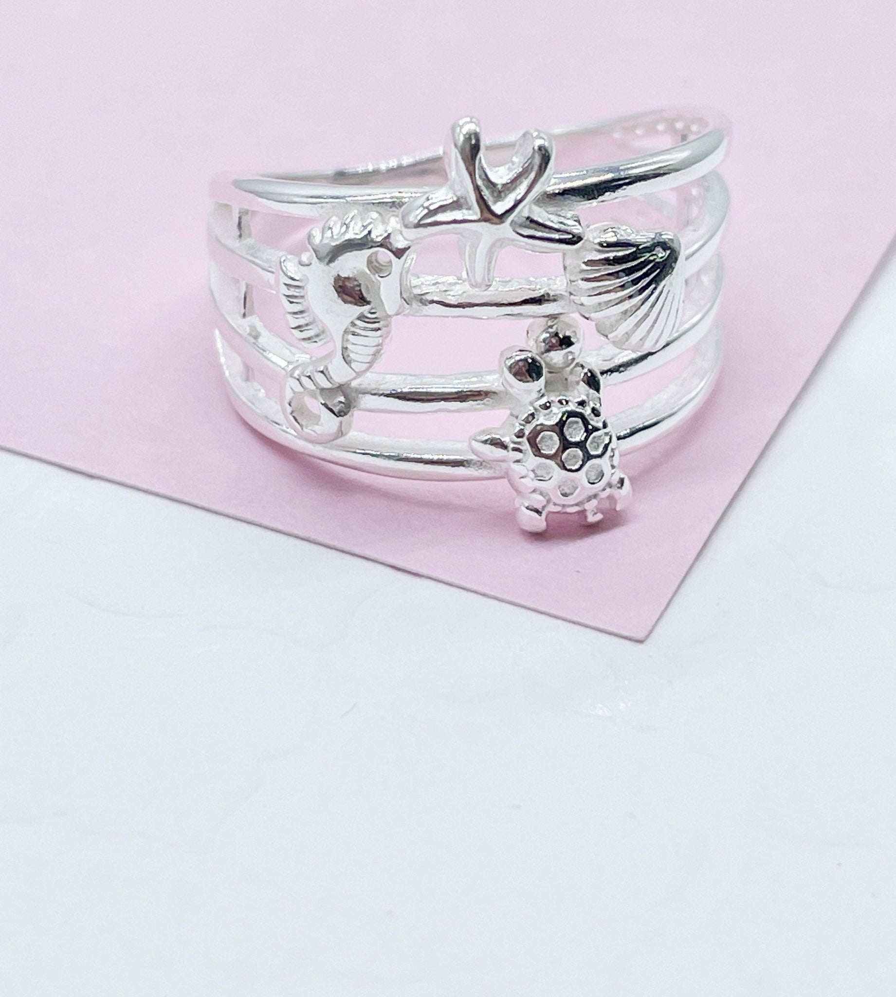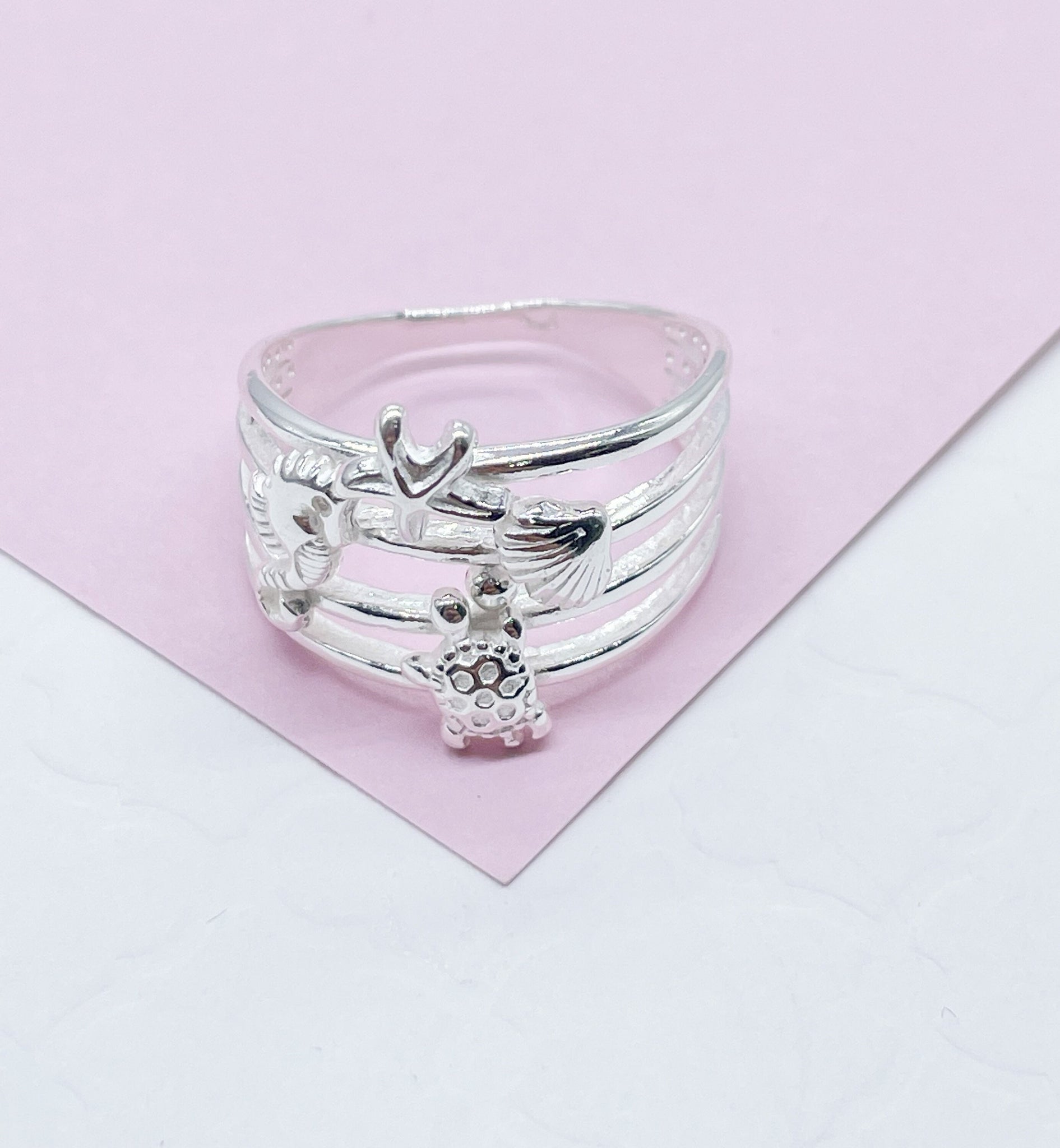 925 Sterling Silver Ocean Themed Ring With Stamped Seahorse, Turtle, Starfish & Sea shells