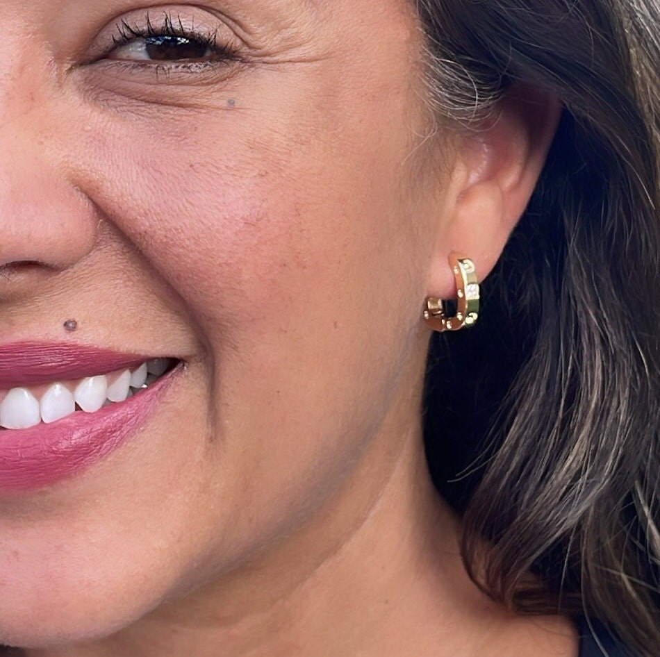 18k Gold Filled Small Screws Flat Square Hoop Earrings. Available in 2 sizes 18 Milimeters and 22 Milimeters!