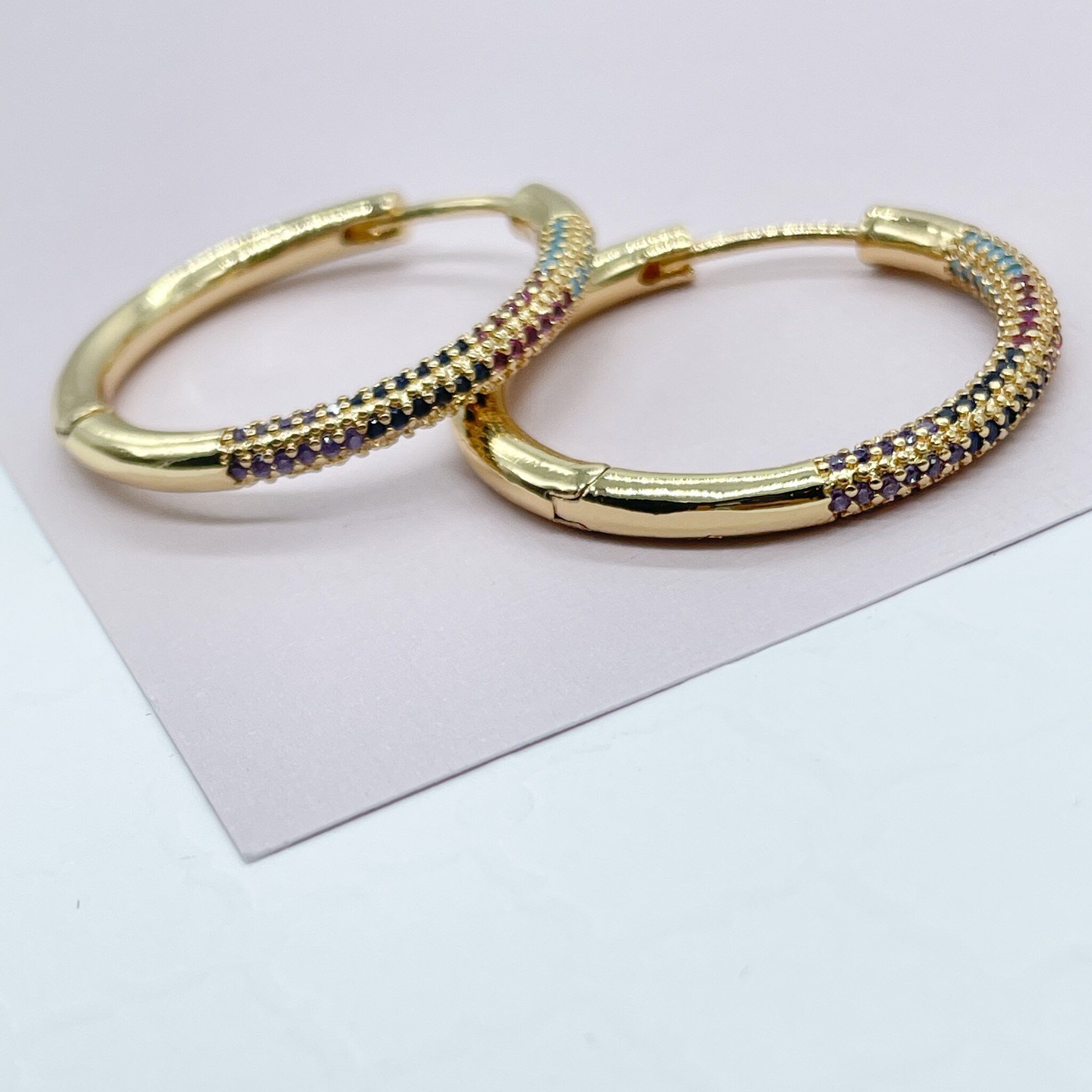 18k Gold Filled Hoop Earrings: Colorful Pave Cubic Zirconia, 1" Diameter