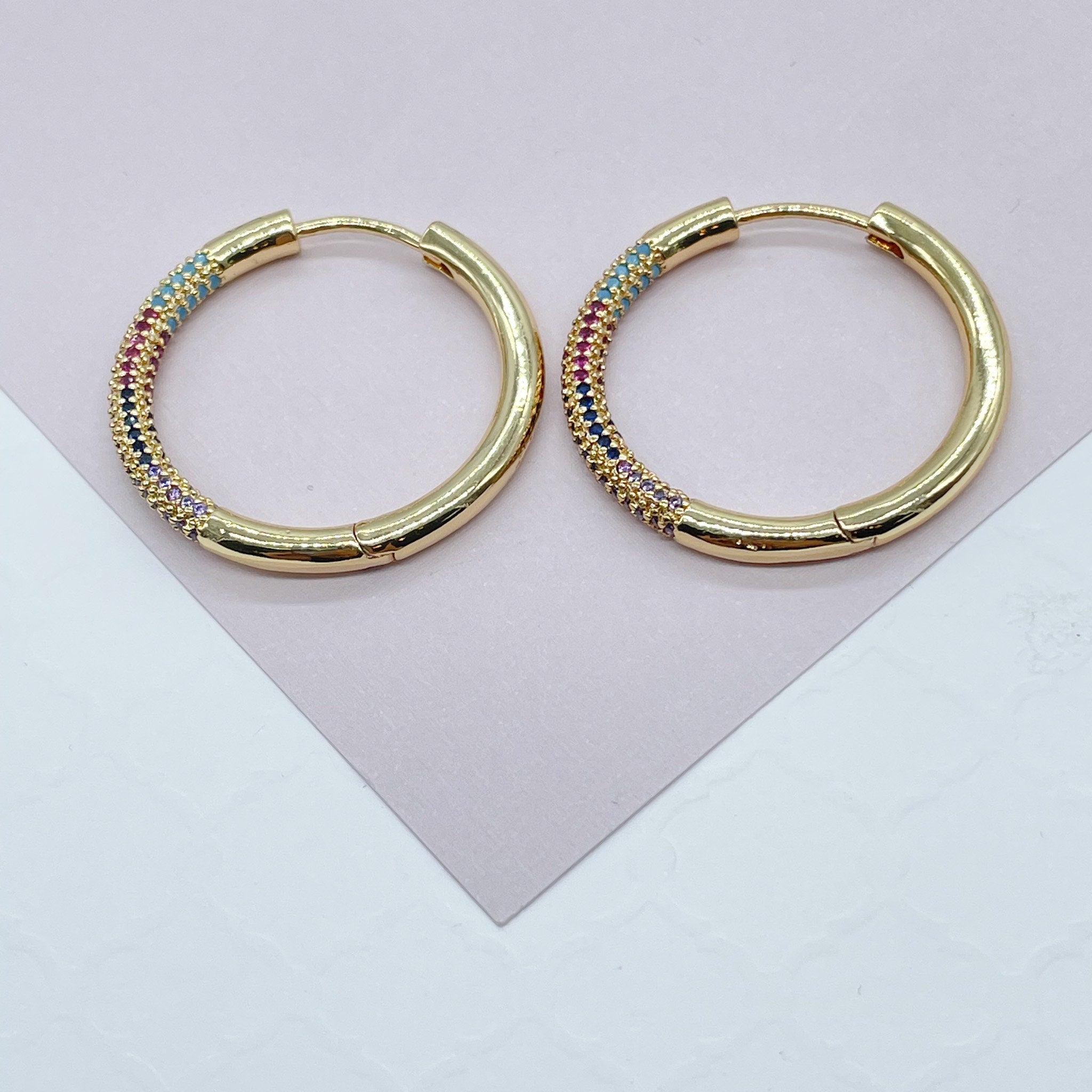Hypoallergenic, 18k Gold filled 1” hoop colorful Zirconia stones