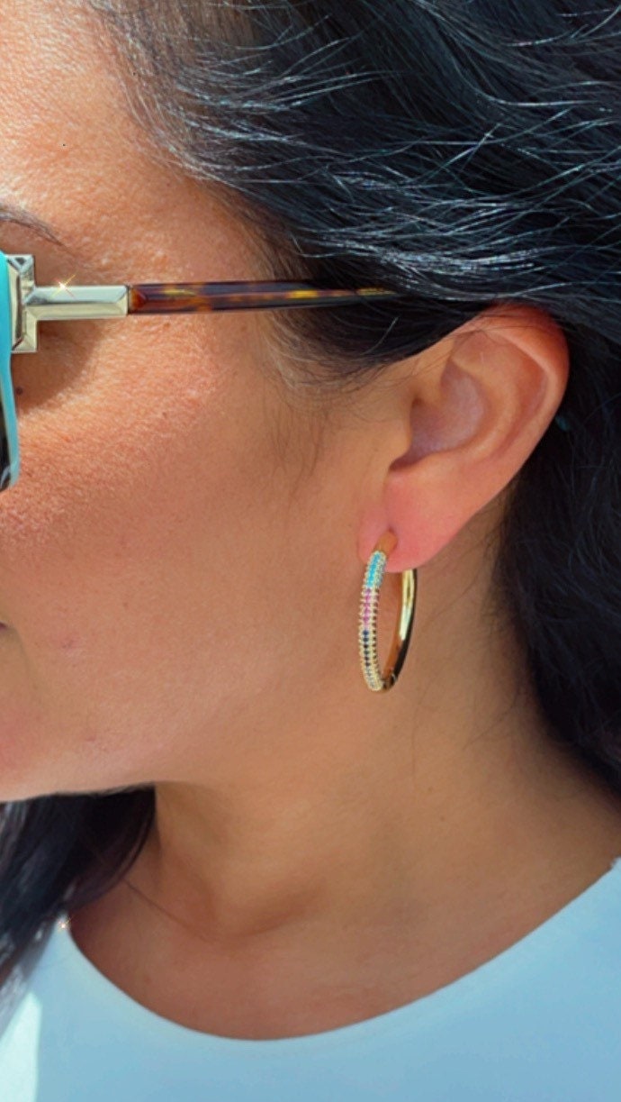Large Thick 18k Gold Filled Colorful Pave Cubic Zirconia Hoop Earrings 1" Diameter in Size - , Fun Hoop to wear